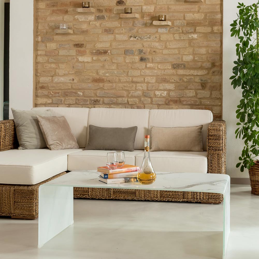 This elegant, contemporary coffee table is crafted from 10mm tempered curved glass with a refined marble-effect finish , giving the room a bright and sophisticated look. Its simple shape and monolithic structure enhance its clean lines.