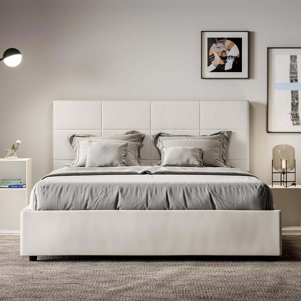 160x200 cm padded double bed made of chipboard panels and covered in imitation leather , entirely Made in Italy. This bed, with its padded frame, is the perfect example of how elegance and comfort can be combined in a single piece of furniture. This model is characterized by itsHeadboard enriched with rectangular geometric patterns . Upholstered in faux leather, it is easy to keep clean: just a microfiber cloth is enough for quick and effective cleaning.