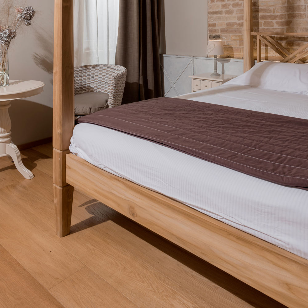 This solid teak canopy bed is a charming piece of furniture, capable of transforming the bedroom into a refined and evocative space. The solid structure and artisanal workmanship enhance the natural grain of the wood , creating a warm and elegant atmosphere with a timeless feel.