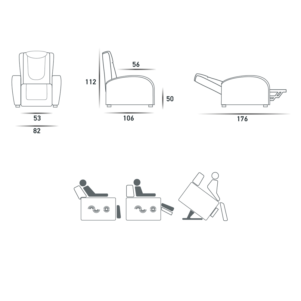 - Vibro: Through the action of a vibrating plate, it massages the lower limbs, stimulating leg decongestion and promoting blood circulation. Raising the footrest and fully reclining the backrest enhances the beneficial effects of this type of massage and amplifies its effects.