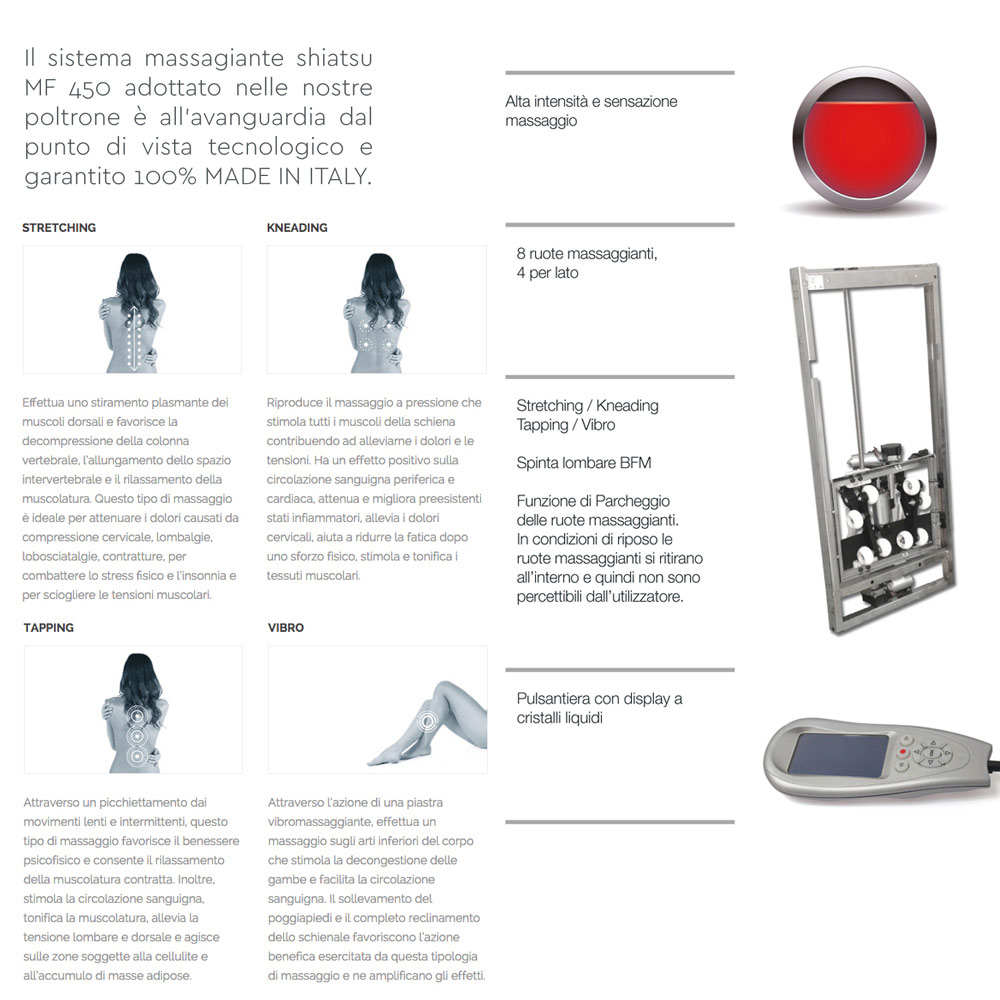 The Bria relaxation chair also features the MF450 Shiatsu massage , a type of massage used to improve blood and lymphatic circulation, generating inner tranquility and physical well-being. The massage system features a mechanism with two arms equipped with massaging wheels mounted on tracks that slide along the contours of the back, providing a constant and even massage across the entire dorsal surface. The MF450 Shiatsu massage system is technologically cutting-edge and guaranteed 100% made in Italy .