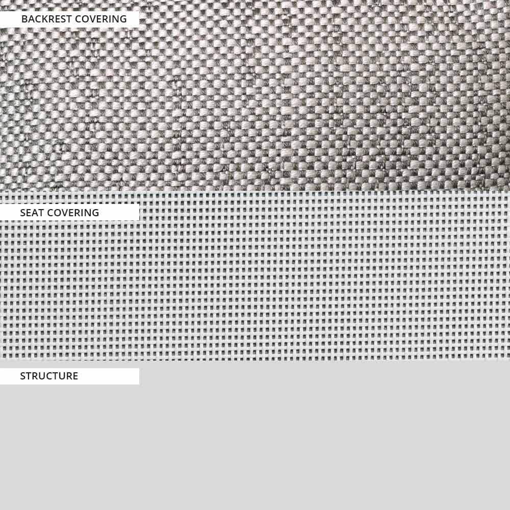 metallic sand gray aluminum, papyrus textilene and salmon melange fabric;