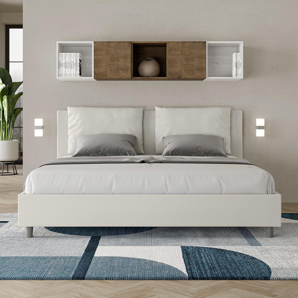 Super king size bed 200x200 cm padded made of melamine panels and covered in imitation leather , entirely Made in Italy. This super king-size bed with upholstered bed frame perfectly embodies the advantages of an upholstered bed: comfort, contemporary style, functionality, and efficient use of space . This bed, with its wide- cushioned headboard , offers a relaxing corner ideal for reading or watching TV, enhancing your bedroom. Elegant and stylish, this bed is upholstered in faux leather, making cleaning quick and easy: simply wipe it with a microfiber cloth to keep it sparkling.
