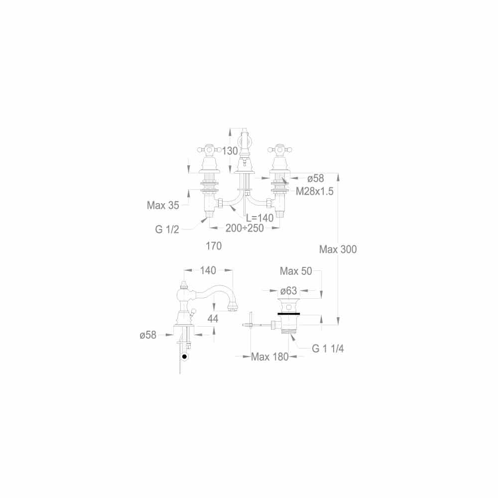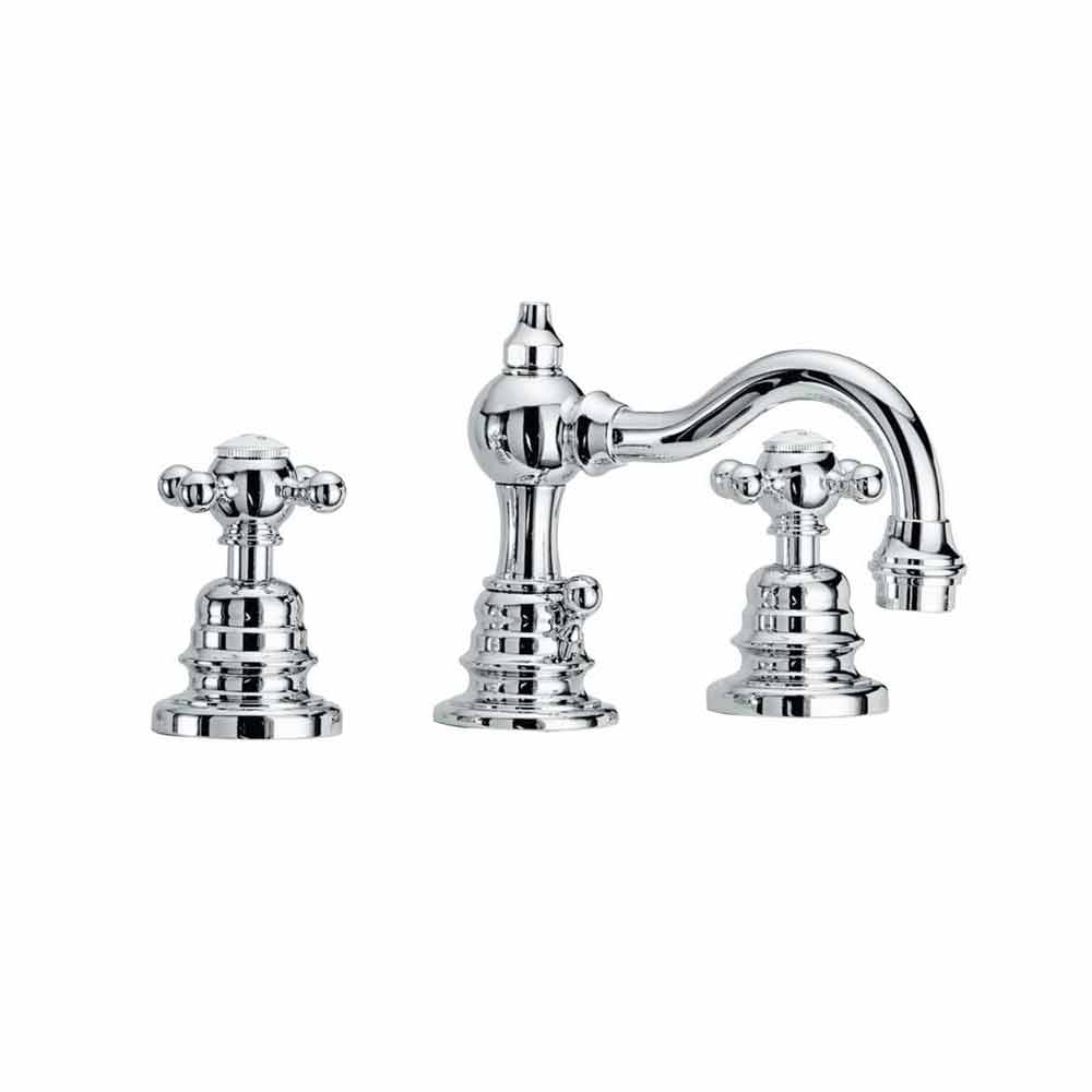 Classic design three-hole countertop washbasin mixer in chrome finish brass 130 mm high and with a 140 mm center distance with drain and pop-up lever. Entirely produced in Italy with high quality materials conforming to European standards. This mixer can be installed on the top, equipped with an aerator and 180 ° ceramic head; recommended for its Energy Saving system for water saving of 6L / min and its swivel spout.
