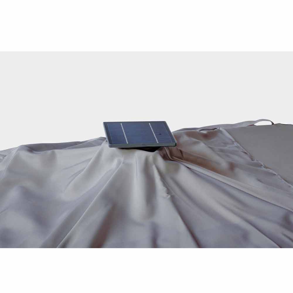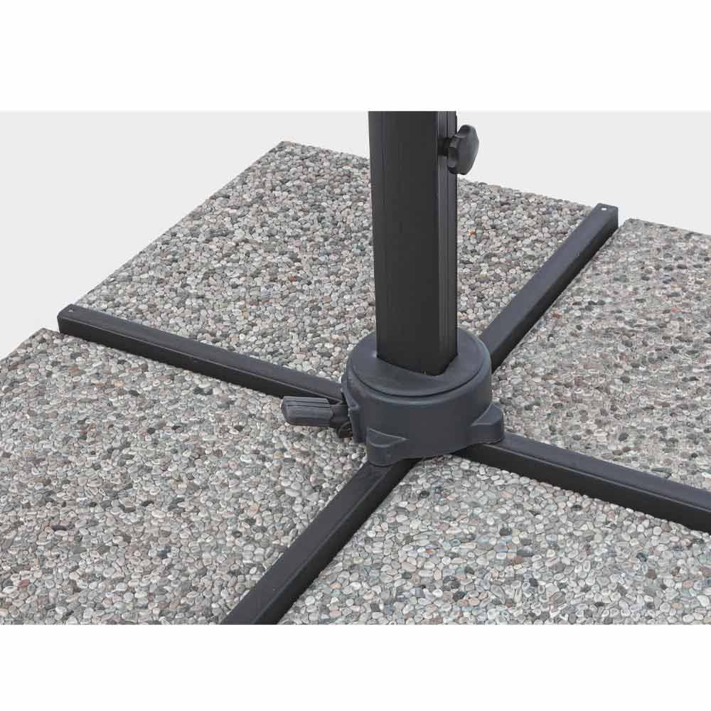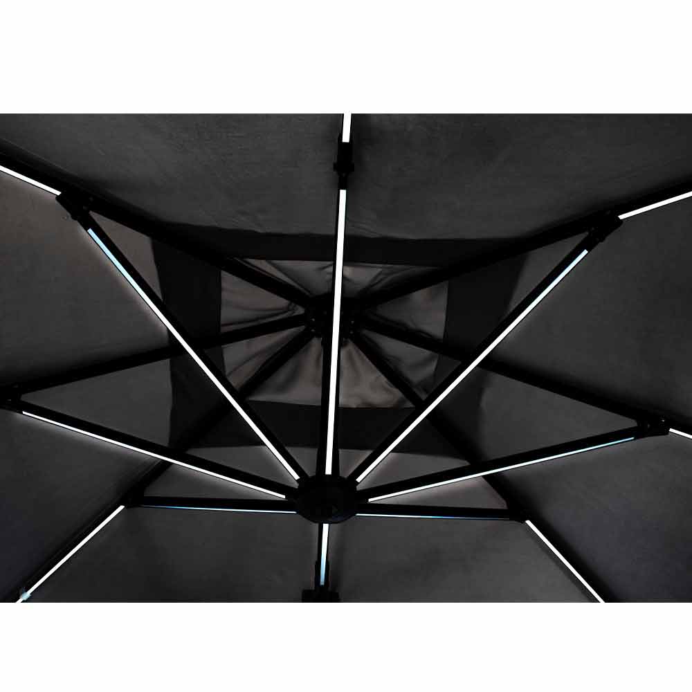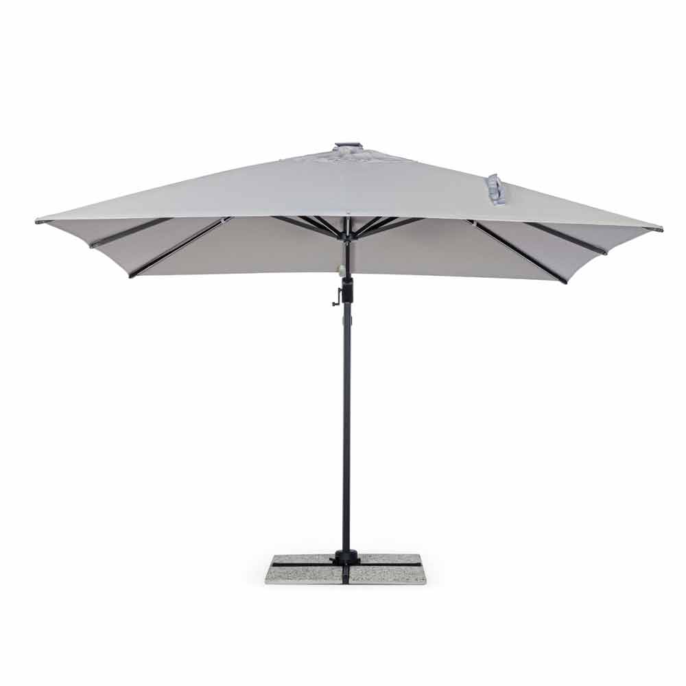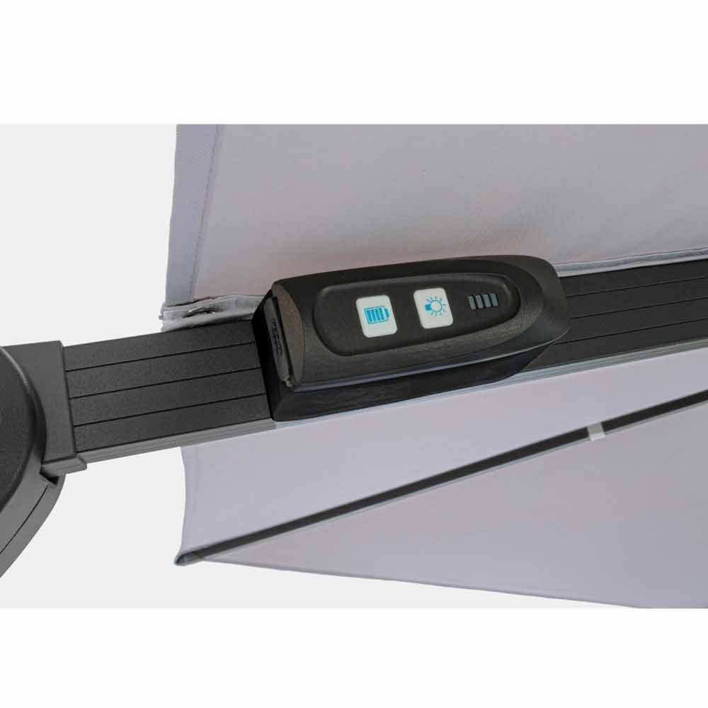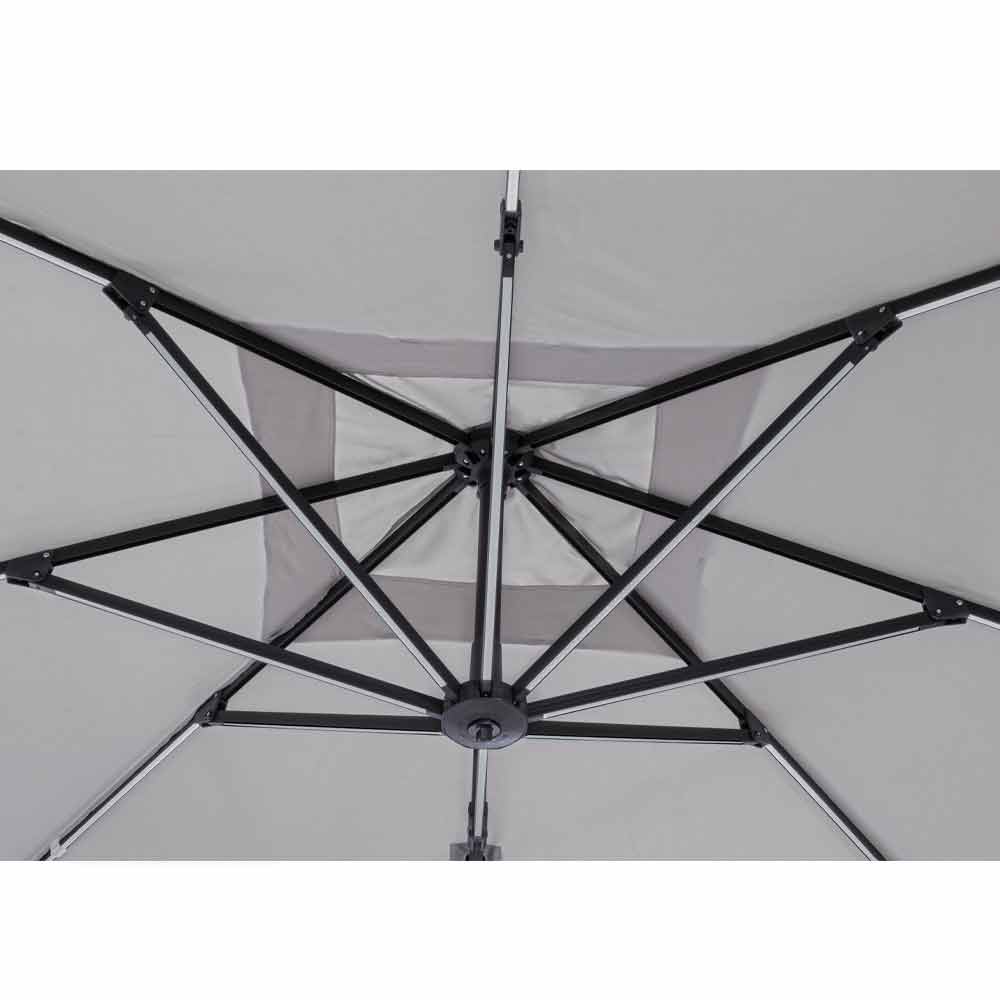 Powder coated aluminum structure (polyester). Pole 77x53mm, 8 ribs 24x14mm with rechargeable white led lights with solar panel included. Light gray polyester fabric 250gr / m2 with pa (polyamide) coating. Cross base in steel . 360 ° rotating pole with pedal. Vertical tilt with 4-position handle. Including umbrella cover.