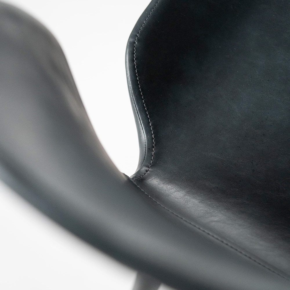 Formal lightness and a strong look describe this chair. The sinuous lines of the seat accompany the body in enveloping support, while the soft-touch covering gives pleasure and comfort. The contemporary design but with a vintage appeal, both in the choice of materials and in the available colours, make this item ideal for a modern but also retro chic living area.