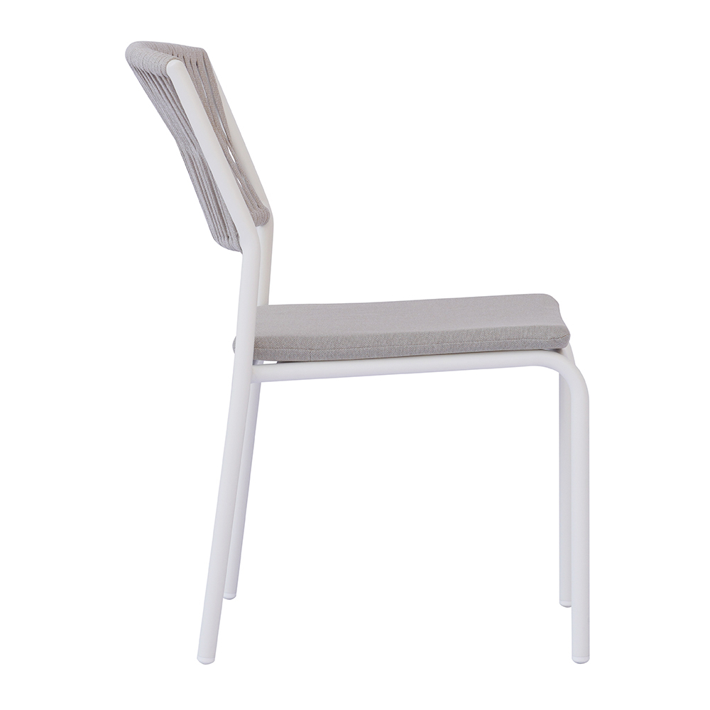 The outdoor rope backrest adds a refined, contemporary touch, ensuring comfort and breathability, while the aluminum seat with matching cushion offers softness and comfort, making every moment of relaxation even more enjoyable.