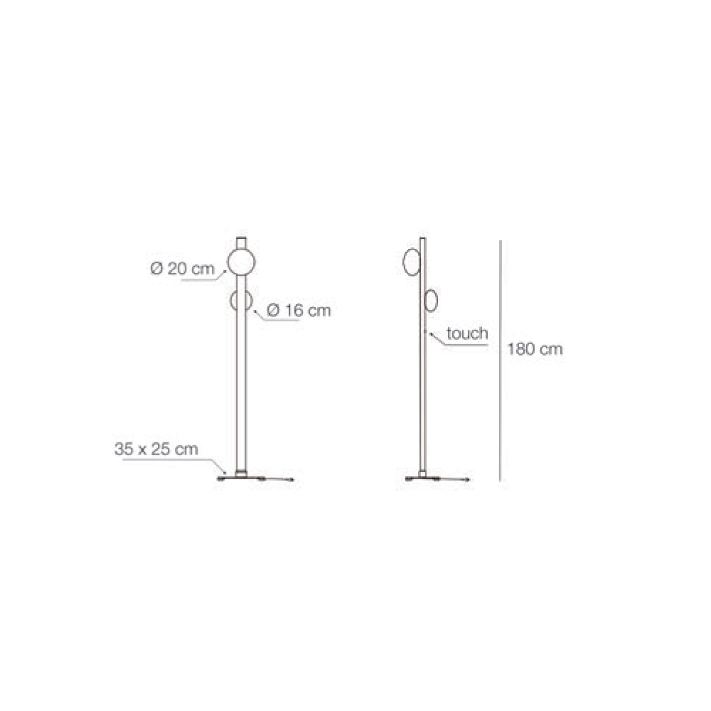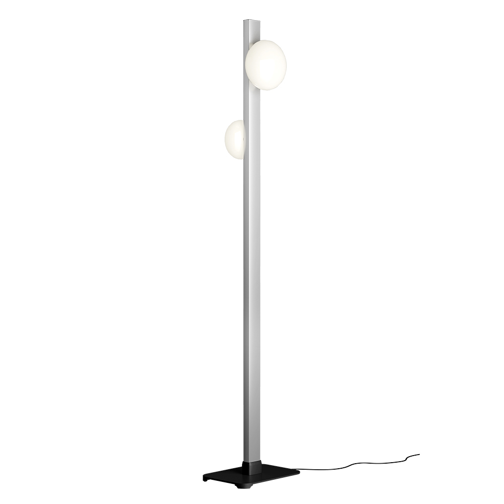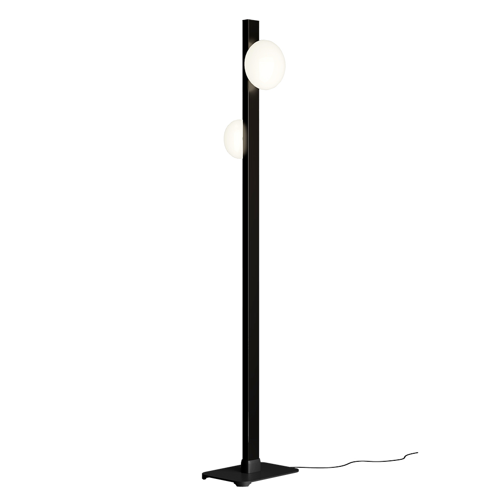 This floor lamp is a perfect balance between sculptural design and functional elegance , ideal for enhancing any space with a modern and refined style. The slender, geometric vertical structure houses two spherical opal glass diffusers , which appear suspended in perfect balance, giving off a soft, enveloping light.