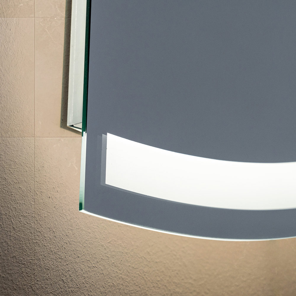 The soft, even perimeter lighting not only enhances the mirror's clean lines but also helps create a welcoming, sophisticated atmosphere, ideal for moments of relaxation and personal care. The simple, unobtrusive structure allows this piece to blend harmoniously into modern, elegant bathrooms, while also lending it a distinctive character.