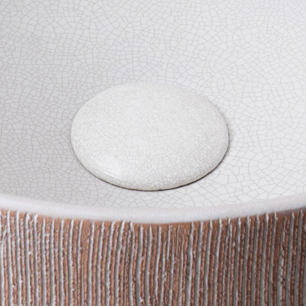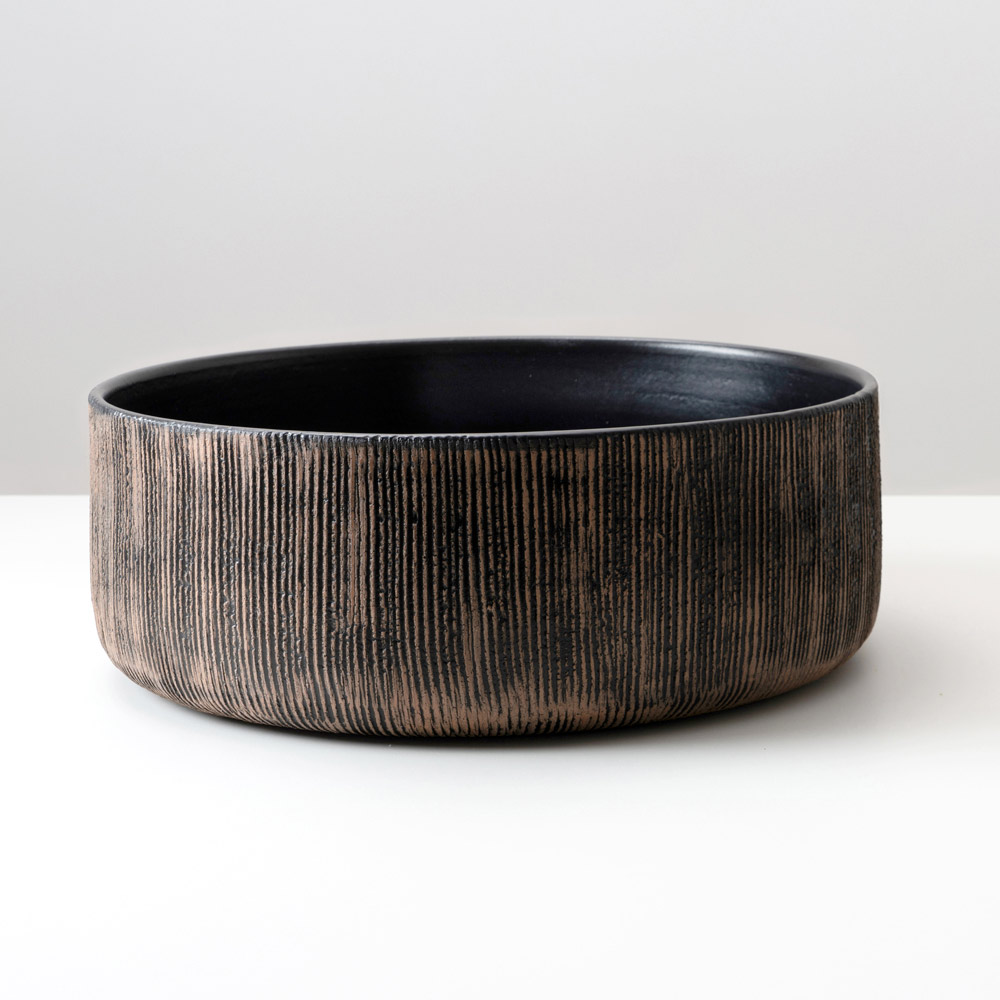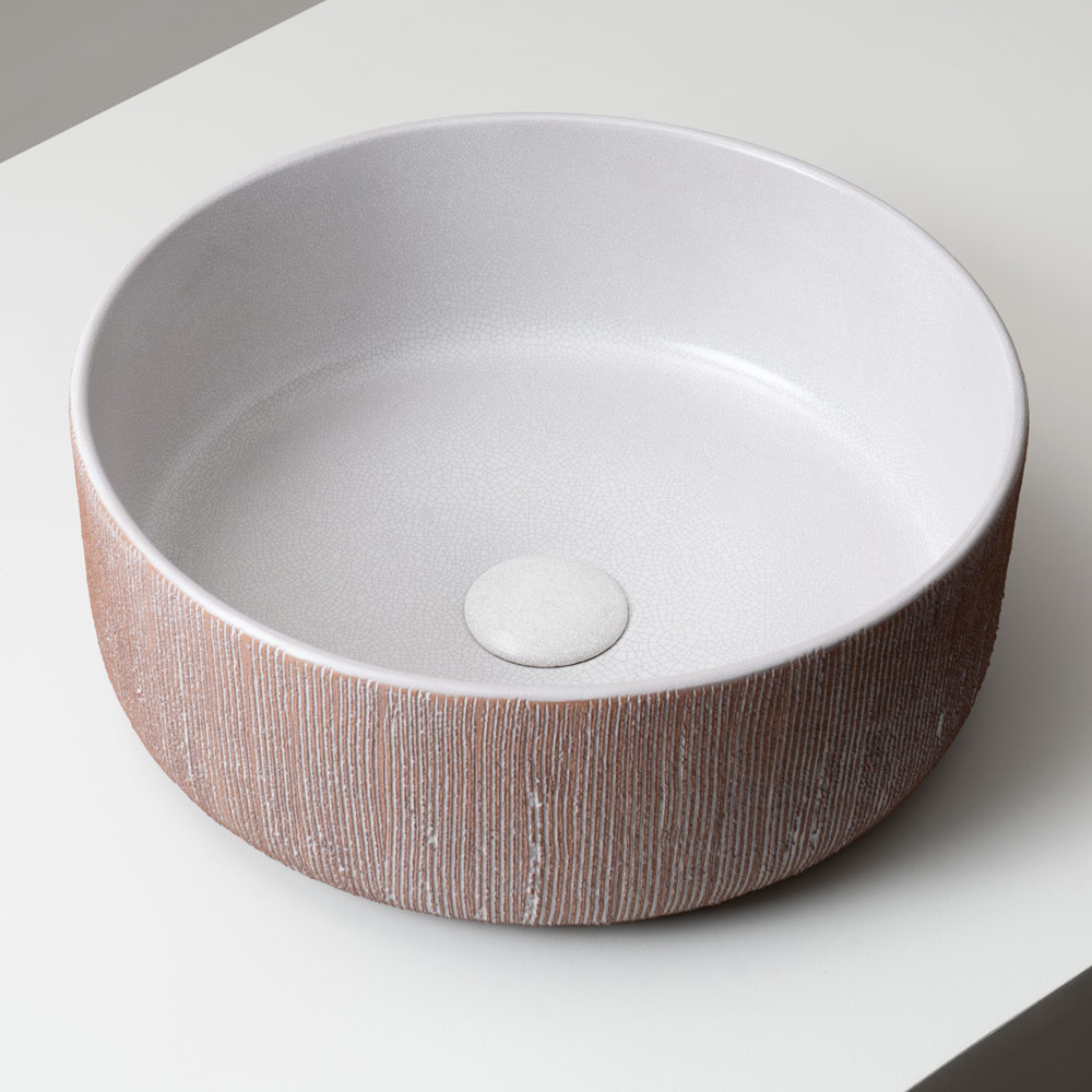 This countertop sink is crafted from natural red earth and finished with a refined , hand-crafted vertical striation . The marks etch the surface like drops carving into the rock , creating a visually striking, textured, and sculptural effect.