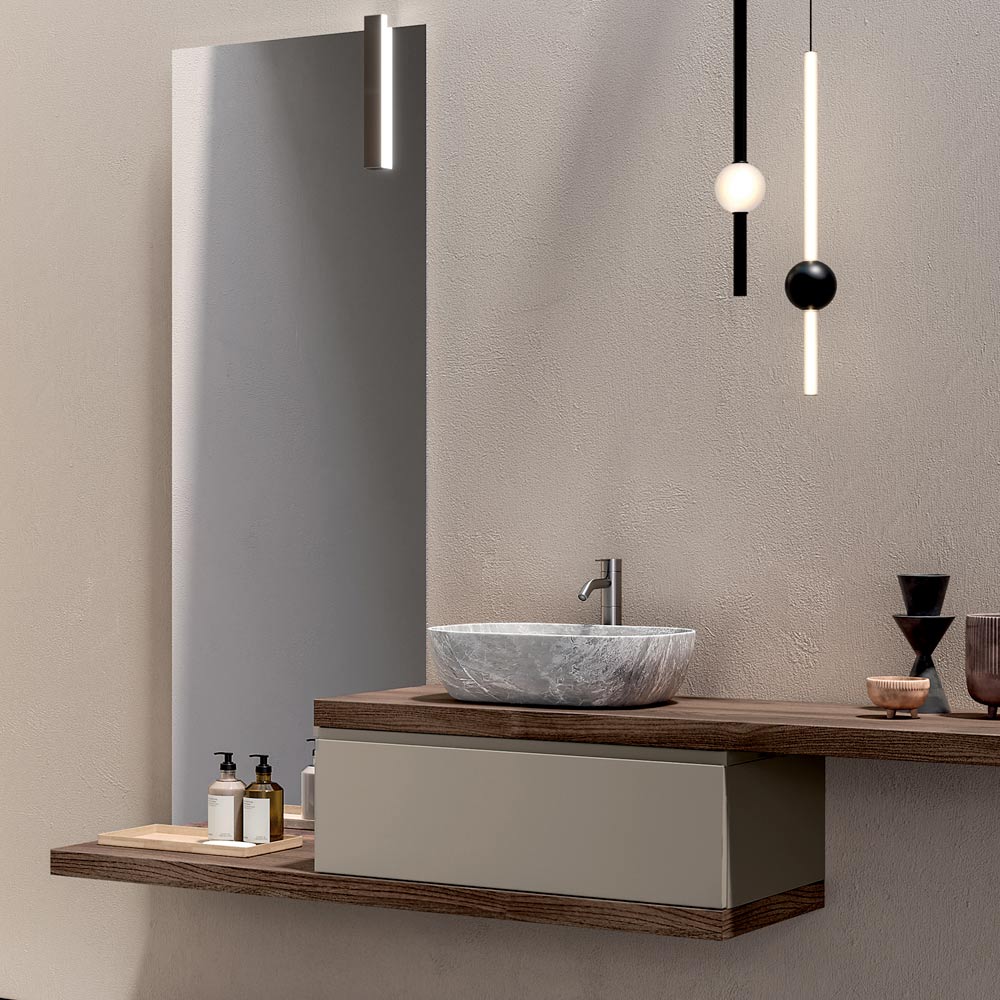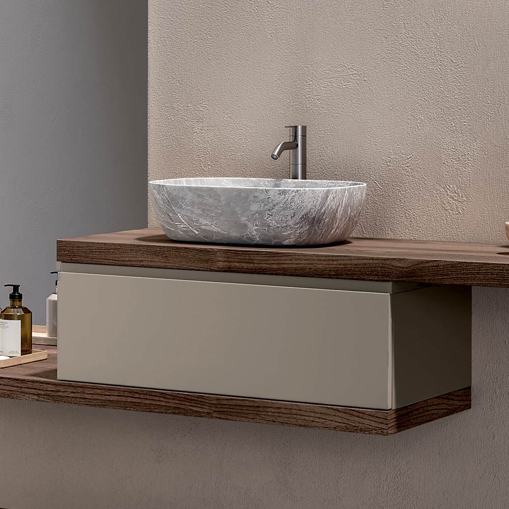 A complete bathroom solution designed for those who want a modern suspended bathroom cabinet , characterised by warm finishes, delicate contrasts and a strong aesthetic identity.