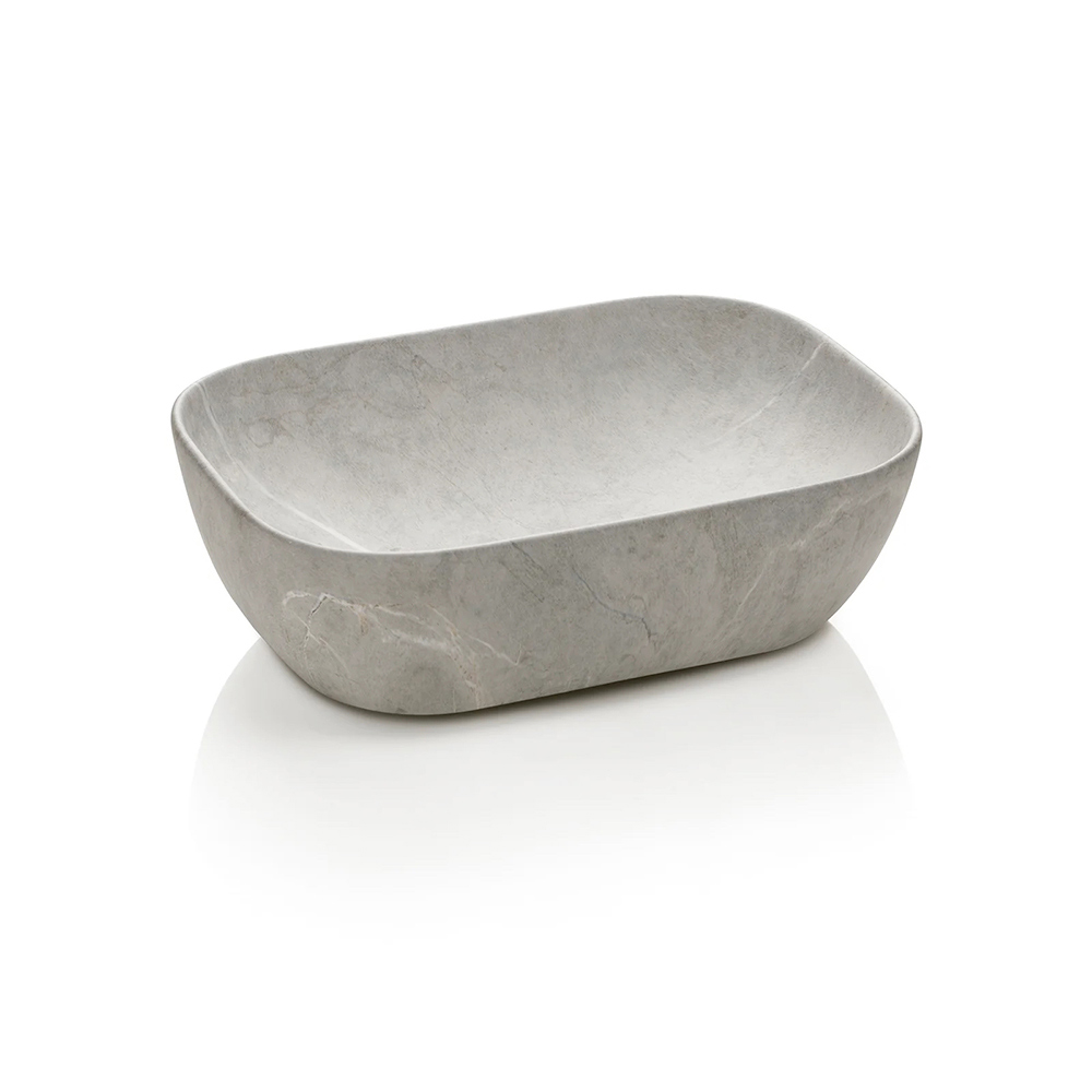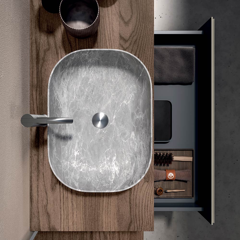 The grey stone ceramic washbasin adds a sophisticated touch of materiality: compact, functional and perfectly integrated into the composition, it combines resistance and style in a single element.