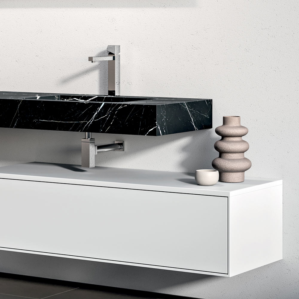A dramatic and contemporary bathroom composition, designed for large, sophisticated spaces. The Marquina-effect HPL double basin top adds character and visual depth, creating a refined contrast with the matt white base.