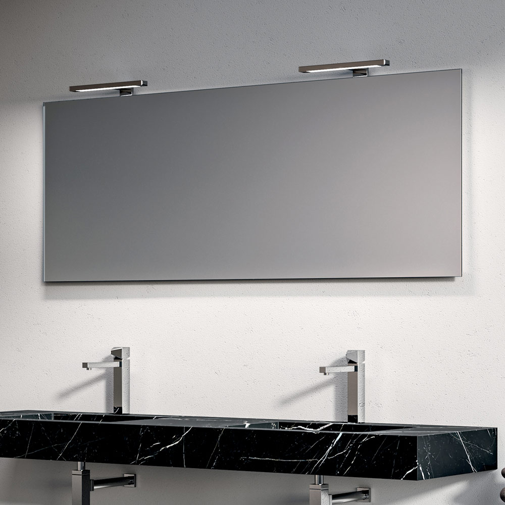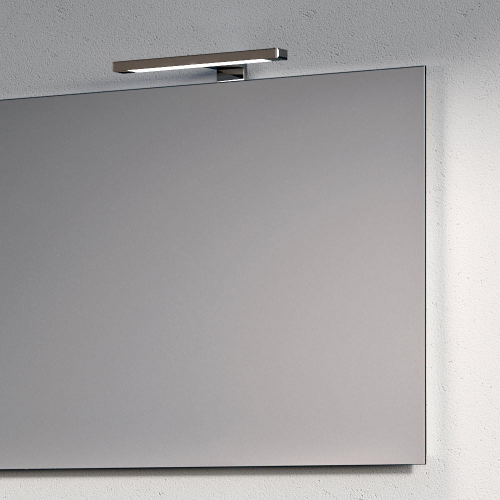 The backlit mirror visually enlarges the space and diffuses a uniform, enveloping light, complemented by elegant chrome LED lamps that add a bright, contemporary touch.