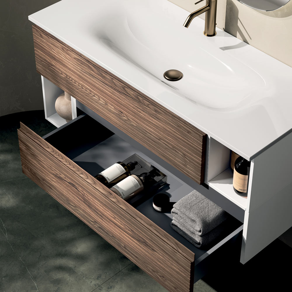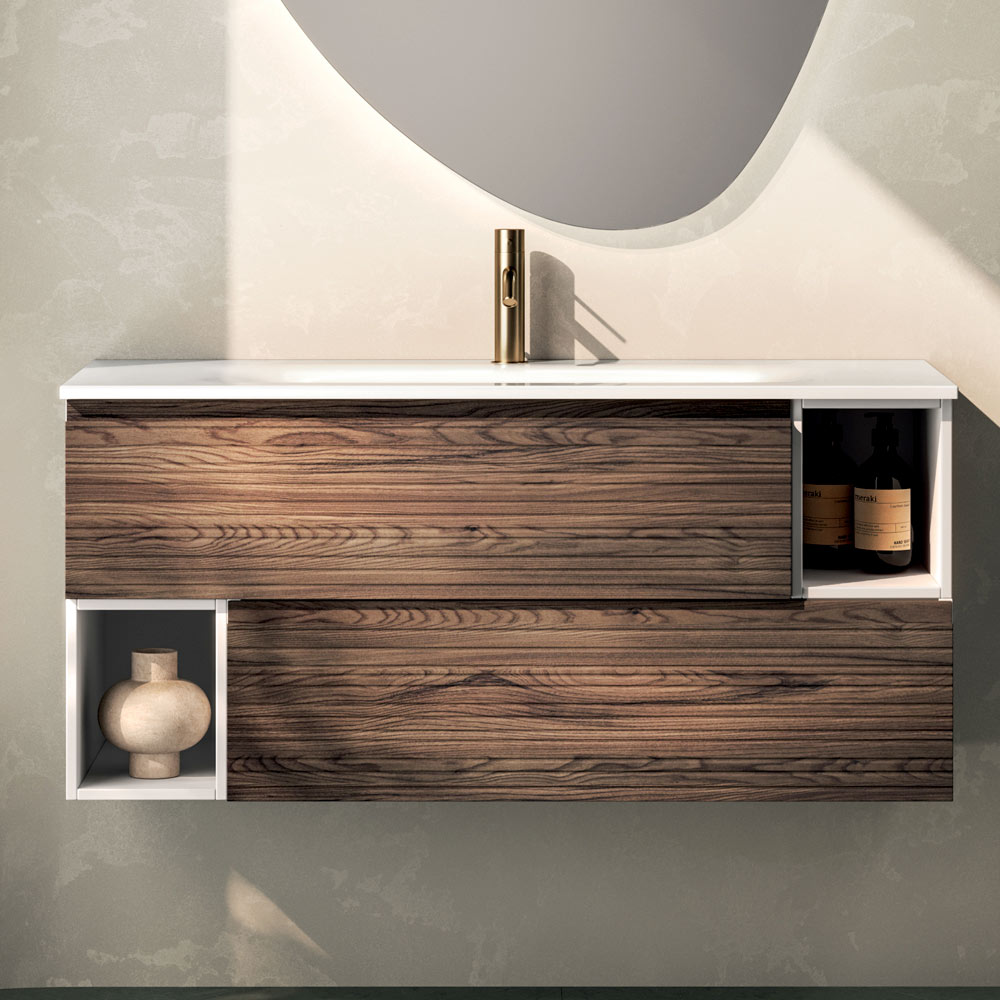 An elegant suspended bathroom composition that combines the warmth of wood with clean, contemporary lines, designed for refined spaces with a strong personality.