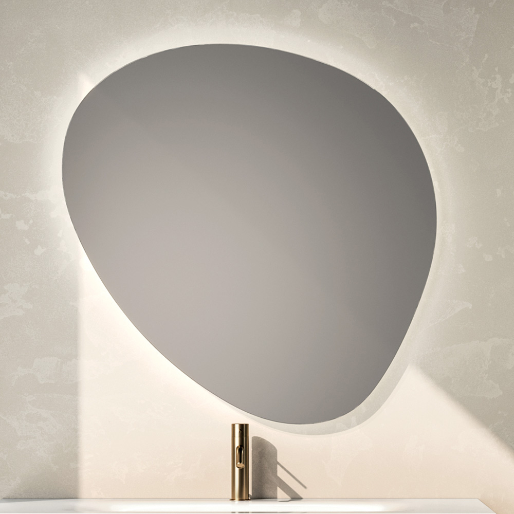 The shaped LED mirror becomes a true furnishing element: its soft shape and integrated lighting create a refined play of light that amplifies the perception of space and gives depth to the bathroom.