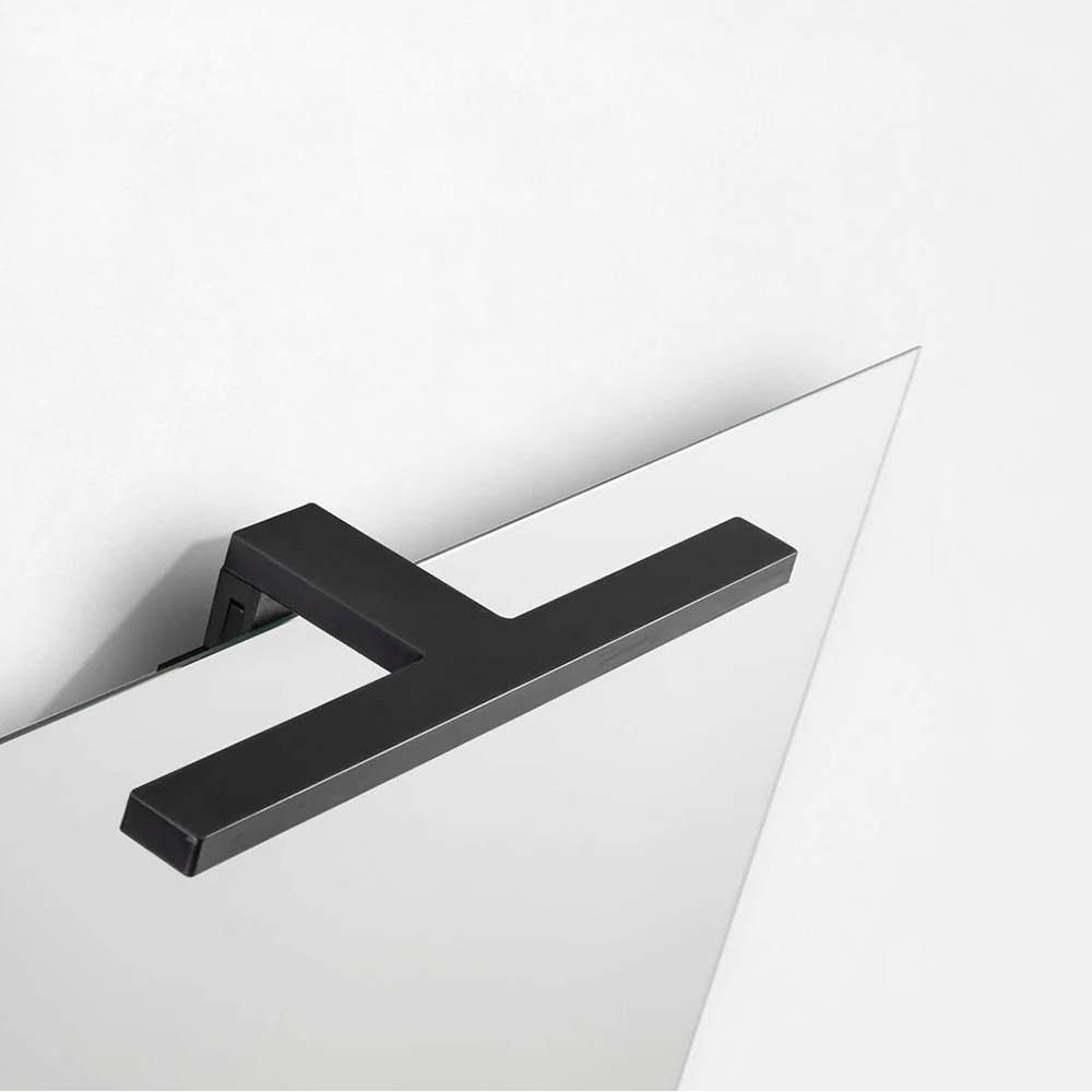The shaped mirror adds a distinctive decorative element, visually expanding the space and enhancing the wall with a refined and contemporary presence.
