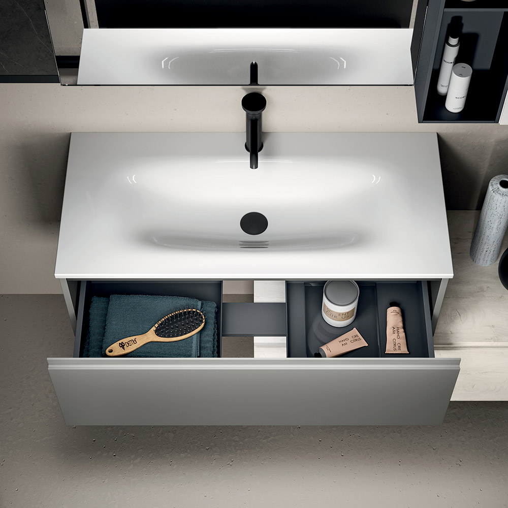The suspended base units with basket , in the refined matt grey and Alaska oak finishes, offer ample storage capacity and help keep the room tidy and visually light.