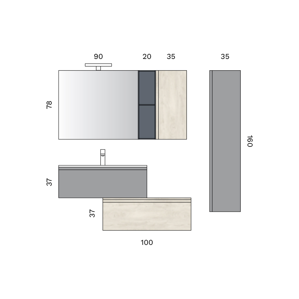 The suspended wall unit in Alaskan oak finish and the anthracite open element enrich the structure with functional and decorative solutions, ideal for organizing and personalising the bathroom space with elegance and practicality.