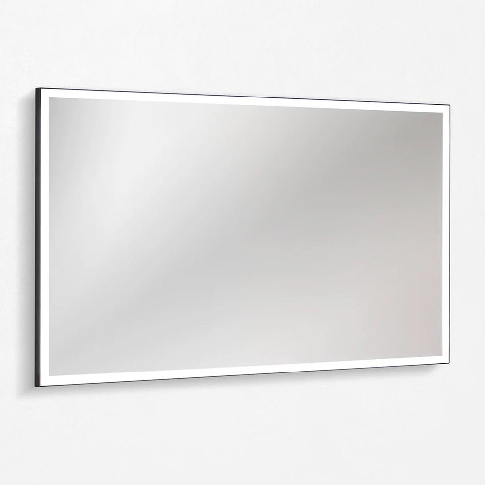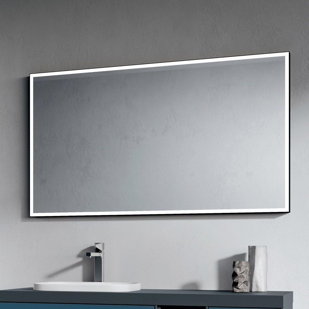 The 120x70 matt black LED mirror completes the ensemble, an elegant and minimal presence that enhances the bathroom lighting and helps create a sophisticated and contemporary atmosphere.