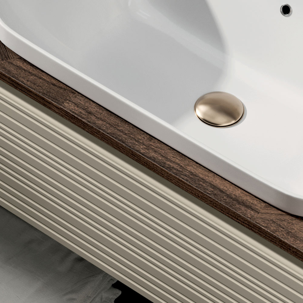 The white ceramic washbasin , with its clean and essential shapes, integrates discreetly into the top, offering resistance, ease of maintenance and a timeless aesthetic.
