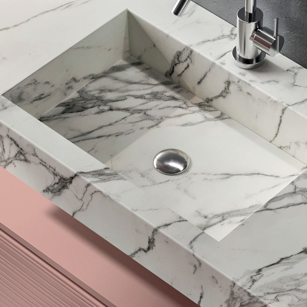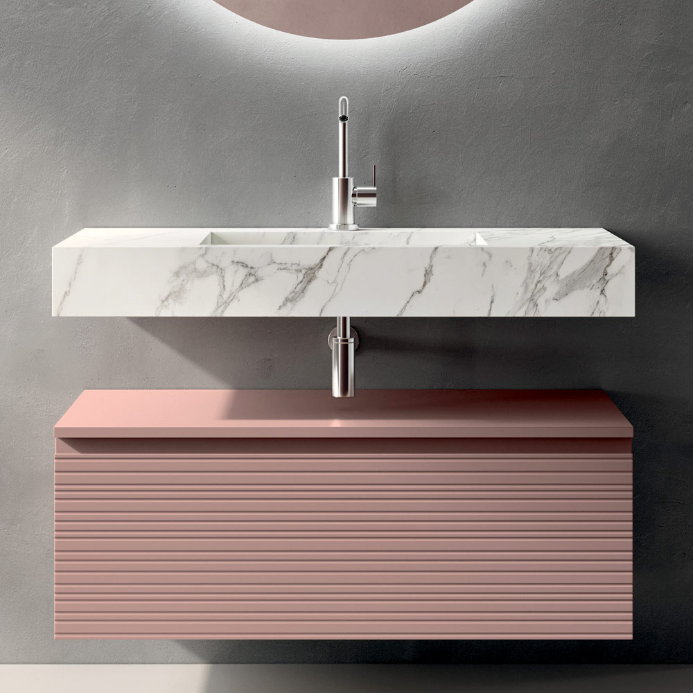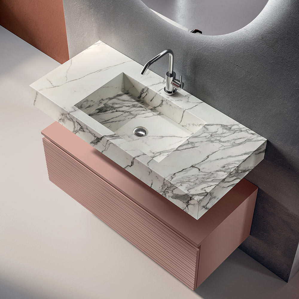 The Calacatta-effect HPL washbasin top introduces a material note with great visual impact: the marble-inspired aesthetic gives brightness and value, while maintaining high performance in terms of resistance and practicality for everyday use.