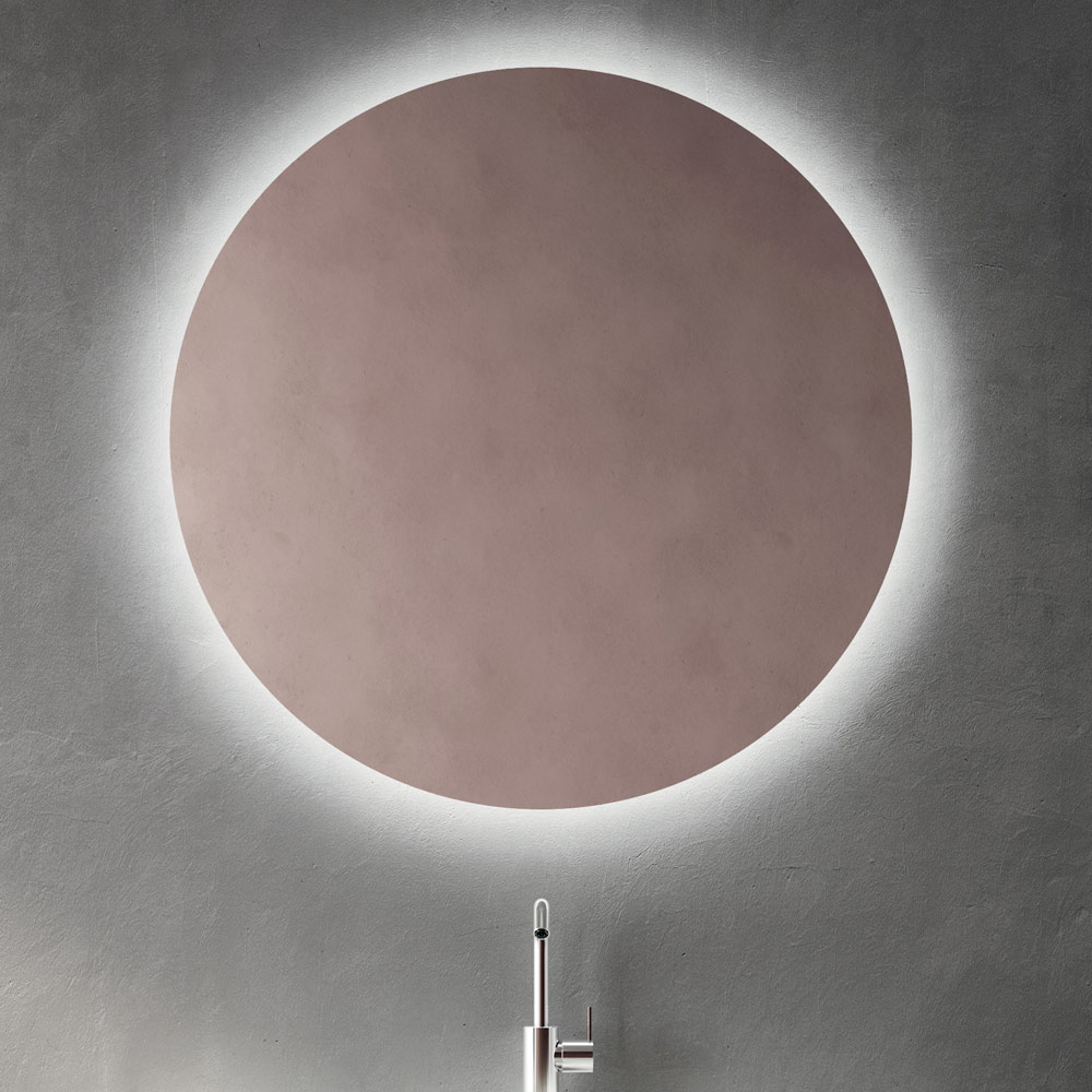 The round LED backlit mirror takes center stage on the wall, offering a diffused, enveloping light that enhances the sink area and helps create an elegant, dramatic bathroom environment.