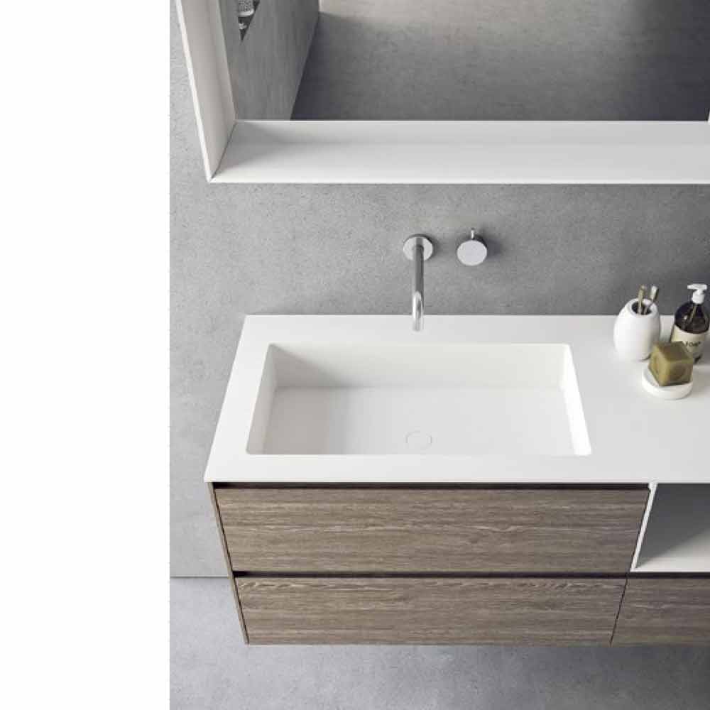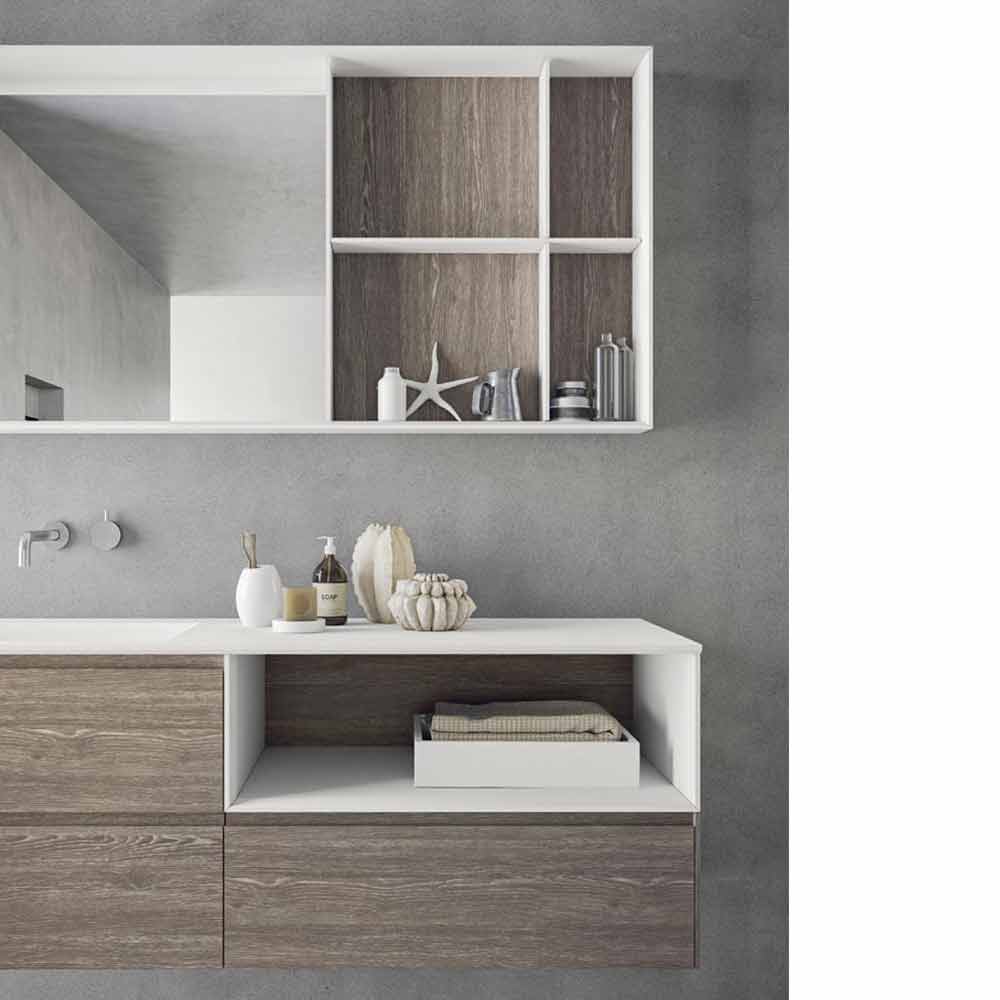 The furniture set is in tobacco oak unicolor HPL , integrated washbasin in matt white Novcryl , open compartment in matt white lacquer and back in tobacco oak unicolor HPL.