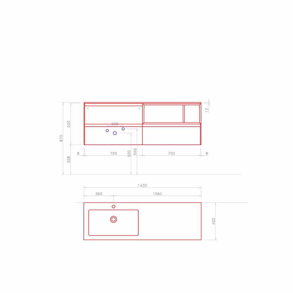 Technical features Structures: in wood particles sp. 16 mm V100 water repellent in class E1 with visible sides faced or lacquered in various shades HPL fronts: in wood particles th. 16 mm V100 in class E1 with ABS edge 12 mm thick Novcryl tops