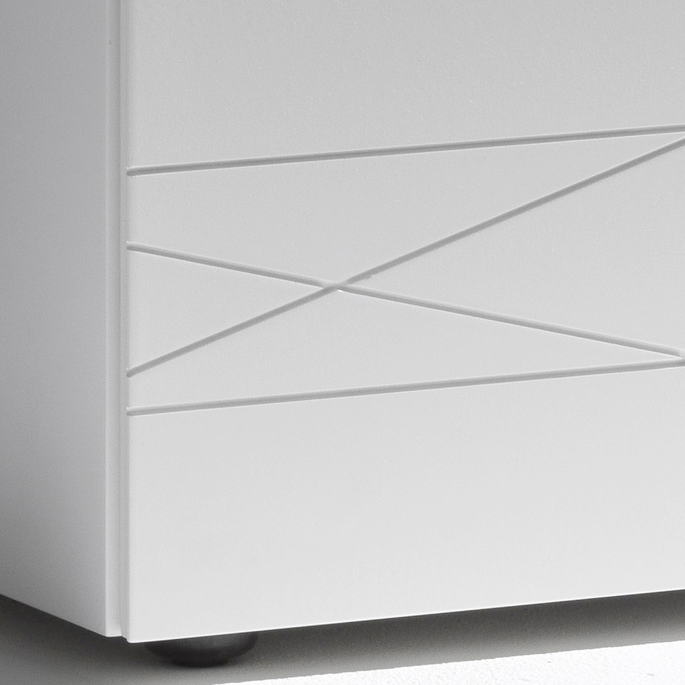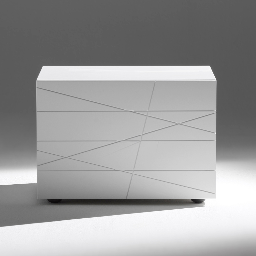 The frame is made of painted chipboard , while the MDF drawer front is finished with polyurethane paints , ensuring a durable, uniform, and high-quality surface. The engraved design on the front creates a refined graphic effect, giving the piece personality without weighing down its lines.