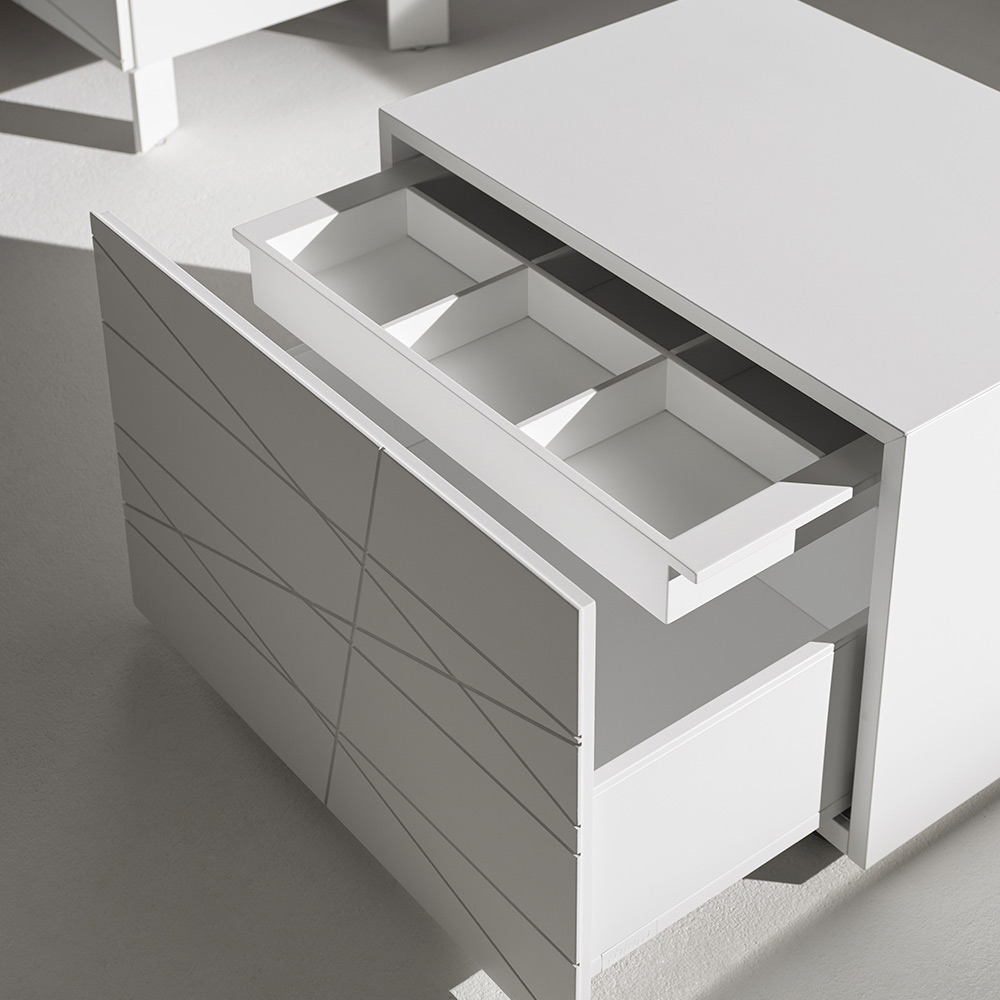 A bedside table with a contemporary and bold design, featuring a geometric aesthetic and clean surfaces that interact with light. An elegant and functional furnishing accessory, ideal for modern bedrooms and minimalist spaces.
