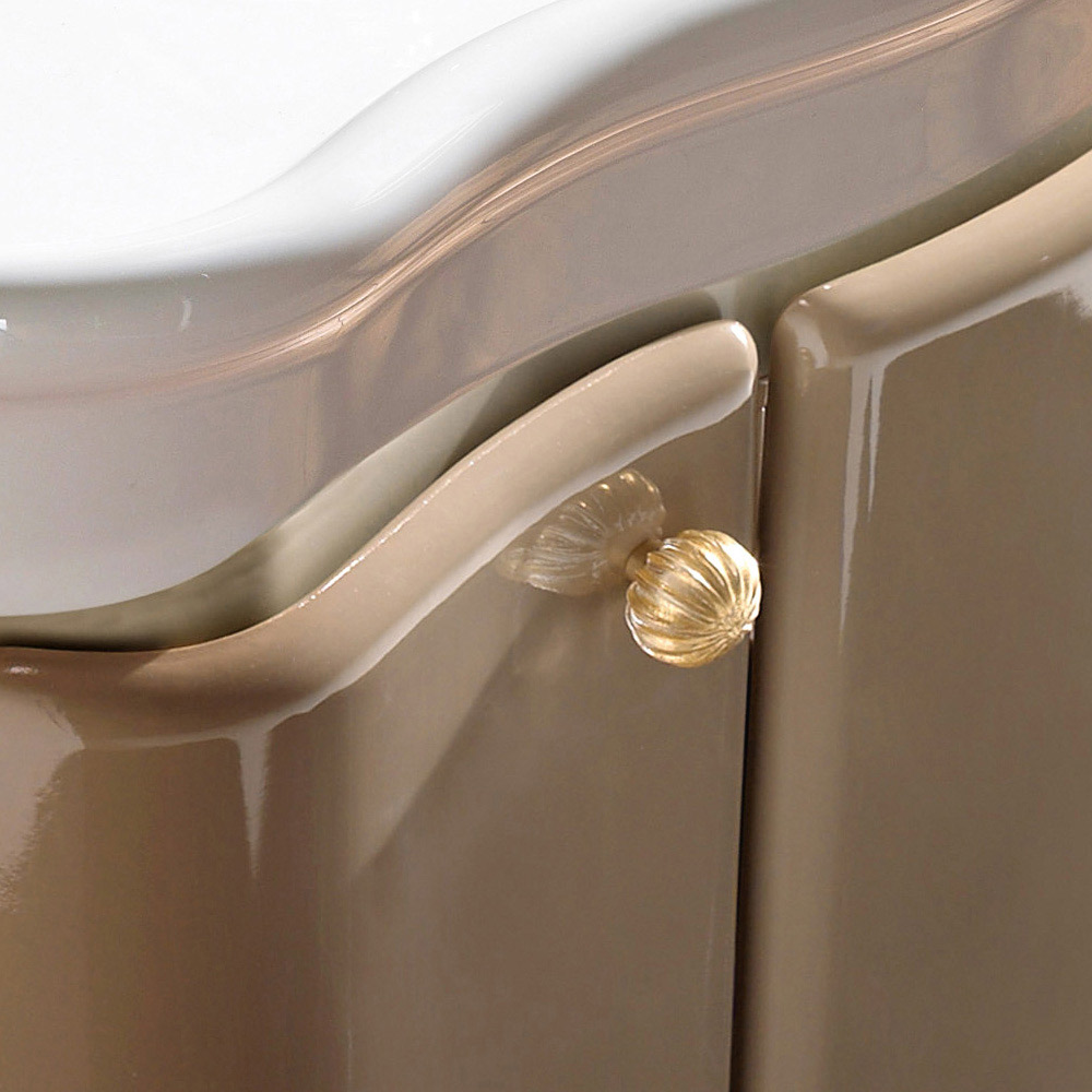 Bathroom cabinet in MDF with two doors and a two-tone caramel glossy lacquered drawer with ivory structure , with white ceramic sink. Brass knobs and sink are included.