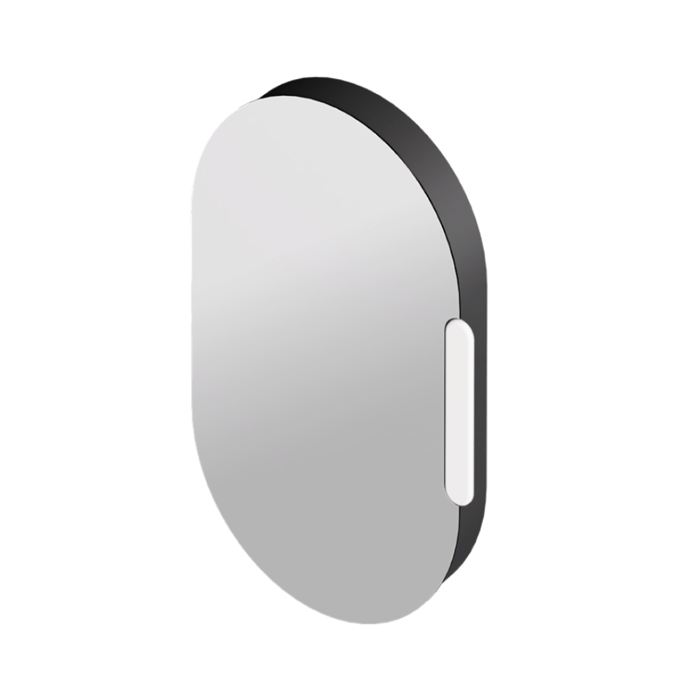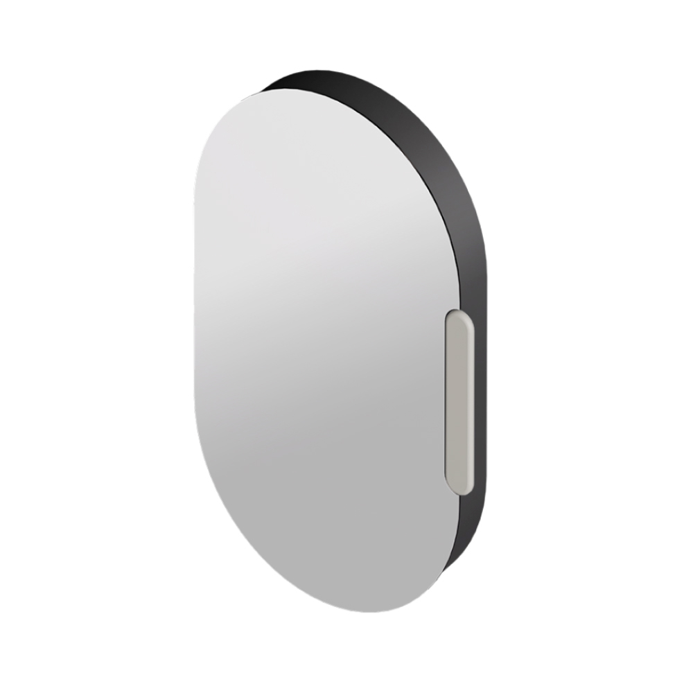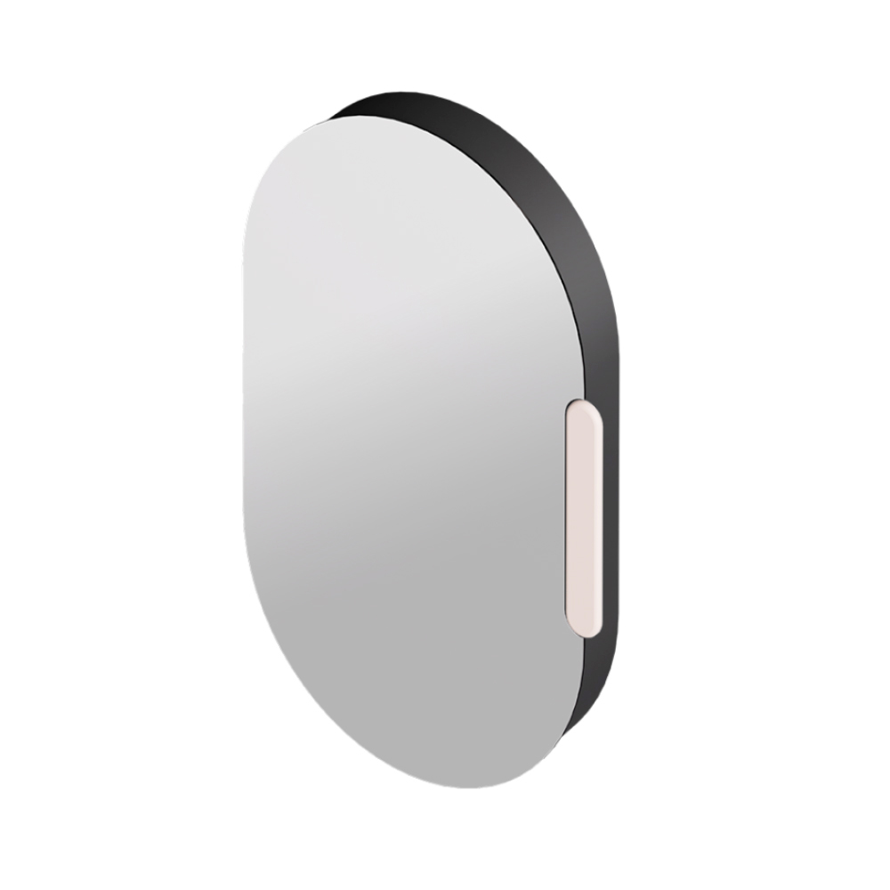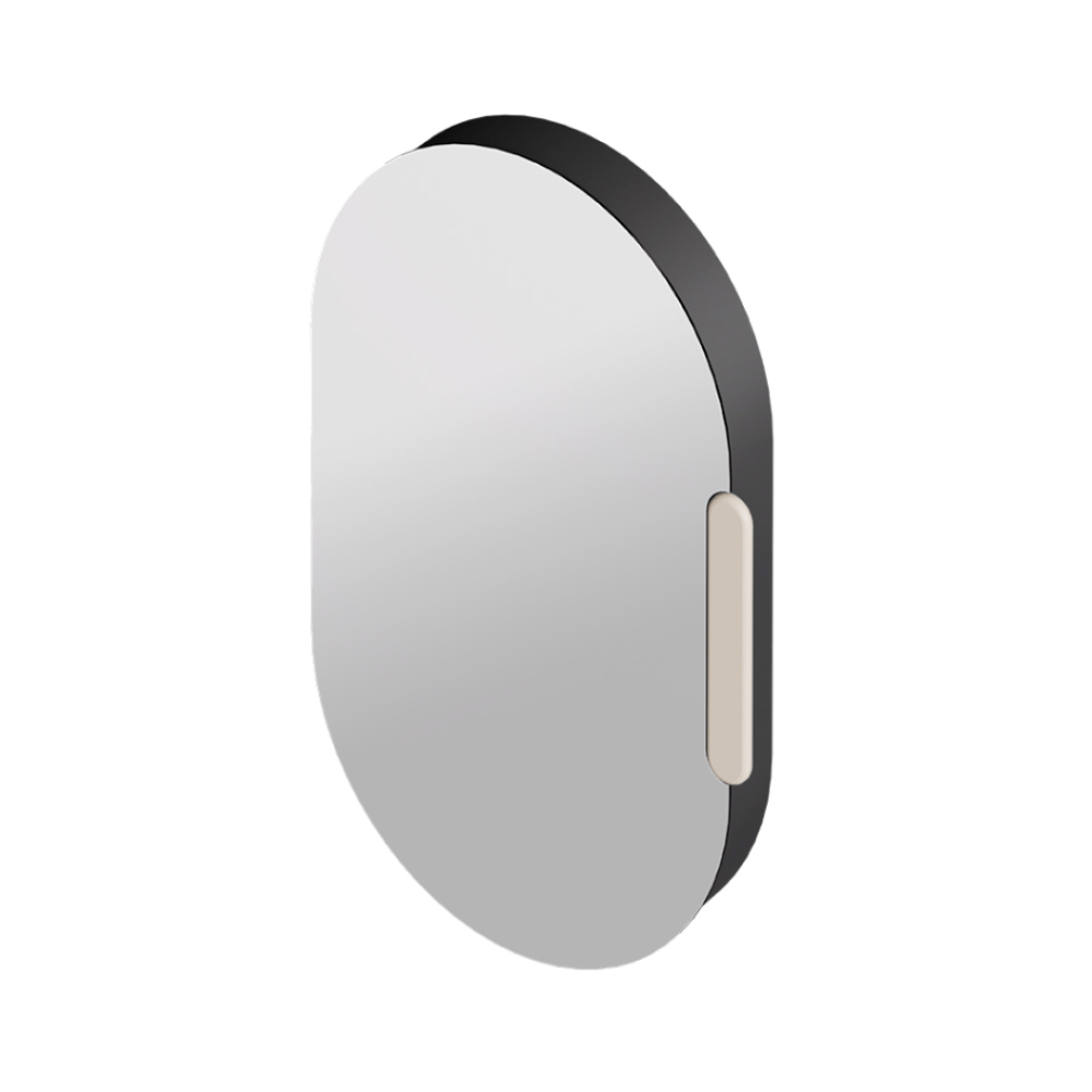 This oval-shaped mirror with a ceramic frame is not only a decorative element but also a smart container : behind the reflective surface are practical open compartments, ideal for elegantly organizing small everyday objects.