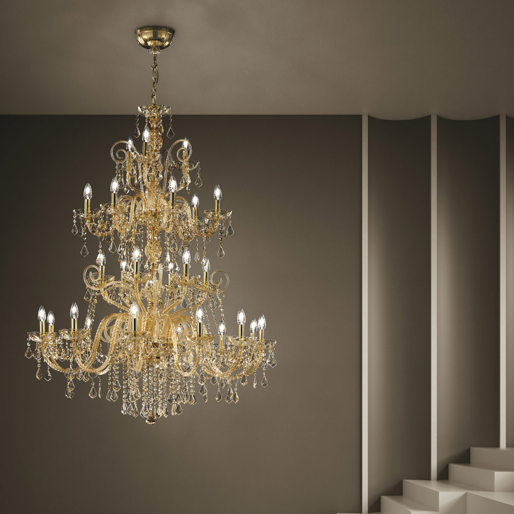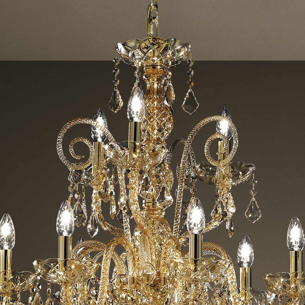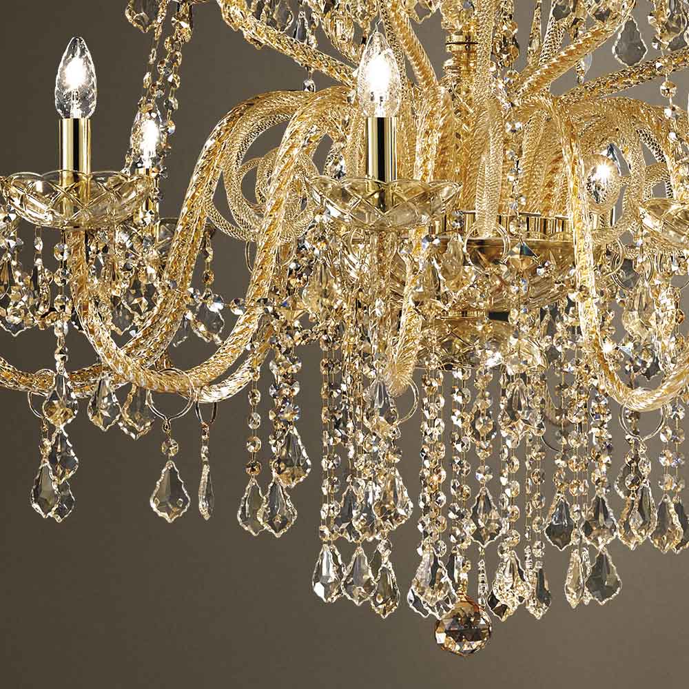 Chandelier with 27 lights made of Venice glass with Amber decoration finish with national pendants and details in shiny golden metal . Made through a craftsmanship , this complement is characterized by the wonderful arms worked by hand through the twisting technique which creates an exclusive result that aesthetically recalls the intertwining of a rope, giving personality to the chandelier. A real rain of light invades the structure of the chandelier and then spreads into the surrounding environment by means of refraction through the magic of sequins and crystal pendants with fine finishes, thus creating an evocative and dreamlike scenographic effect capable of enchanting and surprising. for its elegance and majesty .