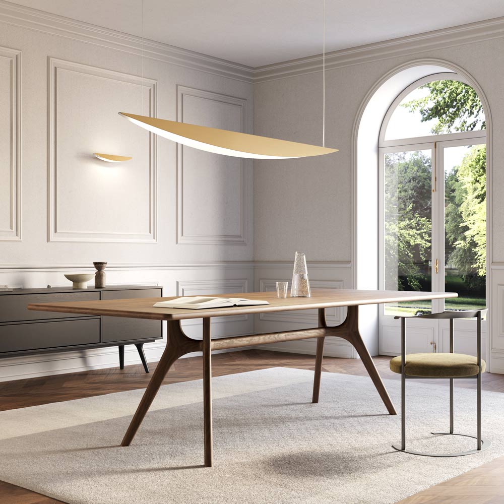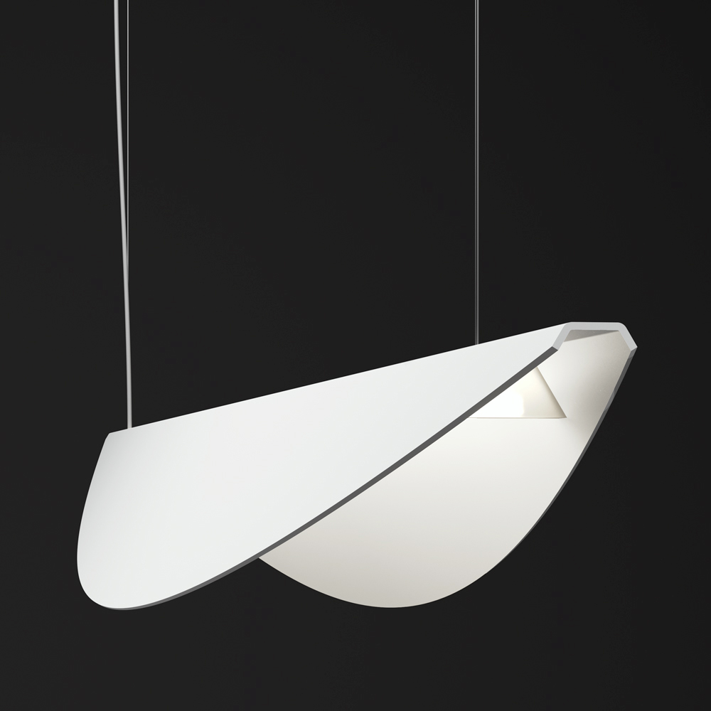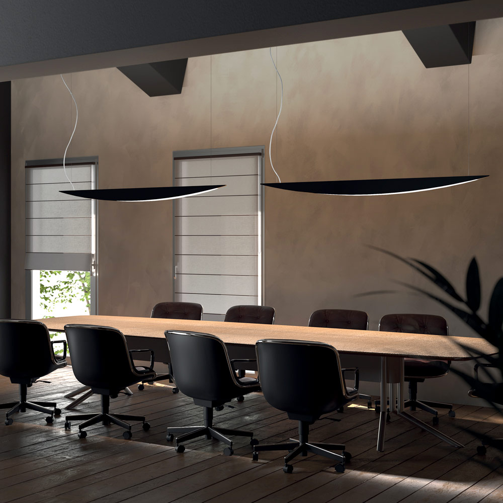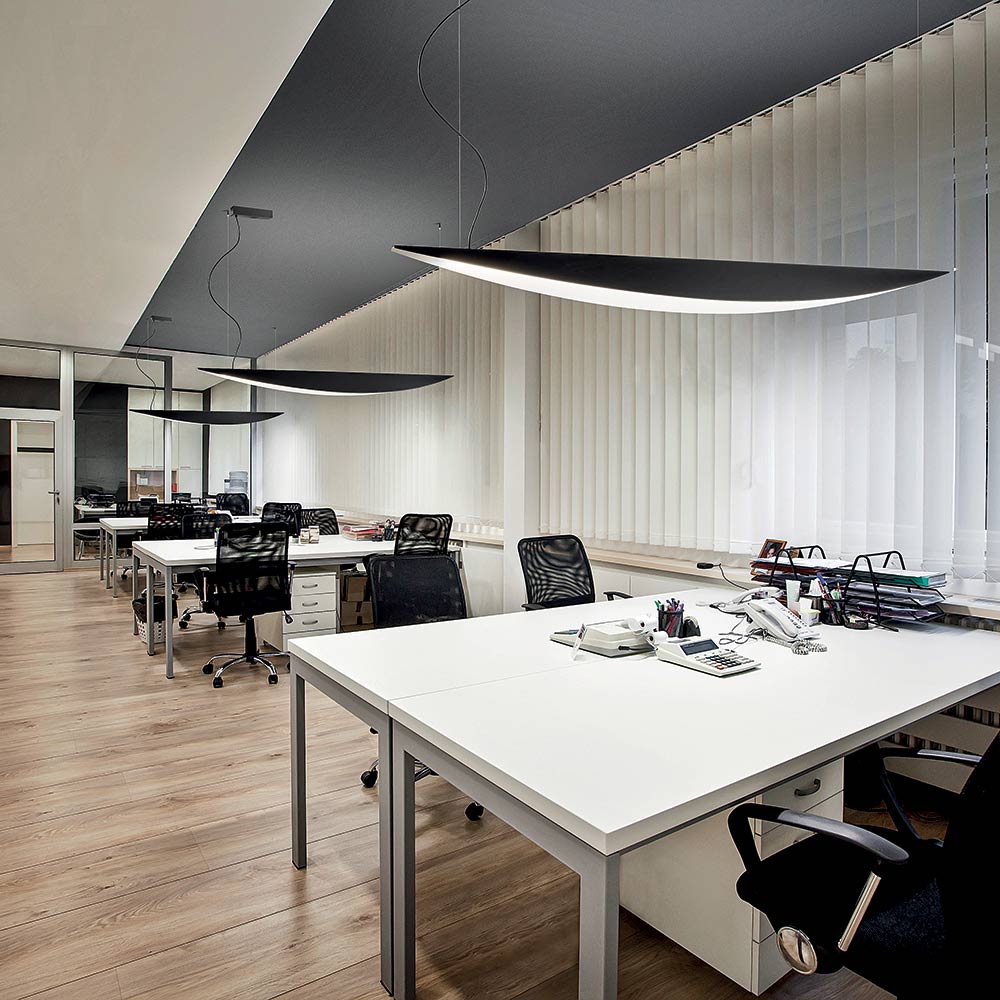 This pendant lamp epitomizes the perfect blend of contemporary design and professional functionality . Its tapered, slim, and aerodynamic shape evokes a wing profile, lending the room a sense of lightness and movement .