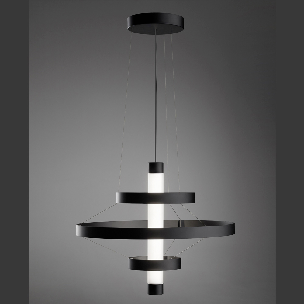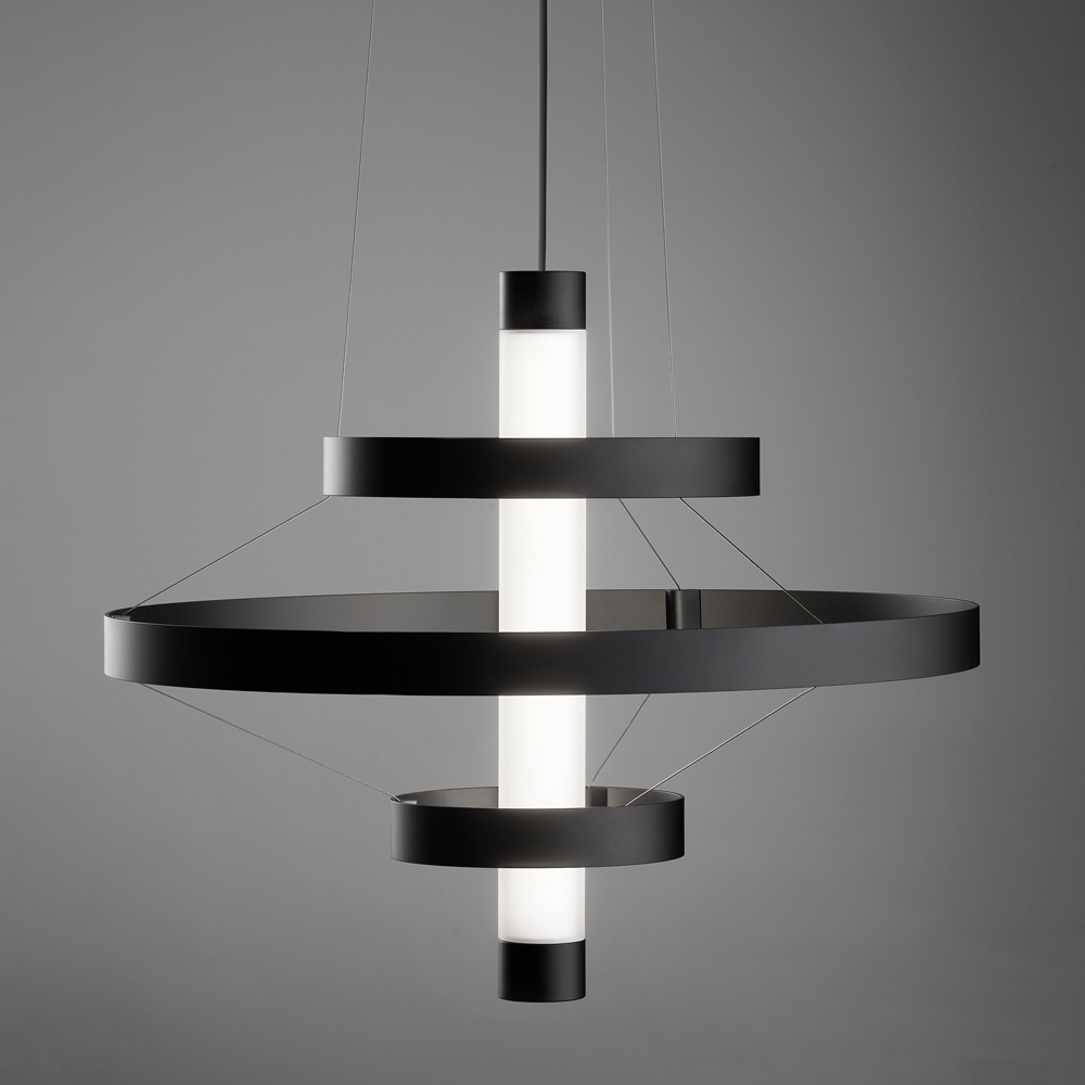 This pendant lamp is a true protagonist in any space: a luminous sculpture that captures the eye and lends personality and prestige to the environment. The structure is composed of a series of concentric aluminum rings , harmoniously arranged around the central body, creating a dynamic, elegant, and three-dimensional visual effect.