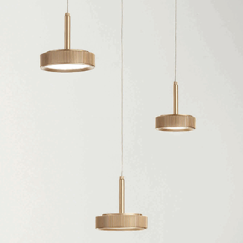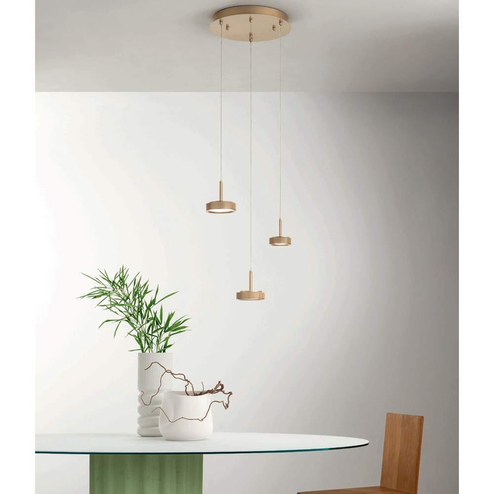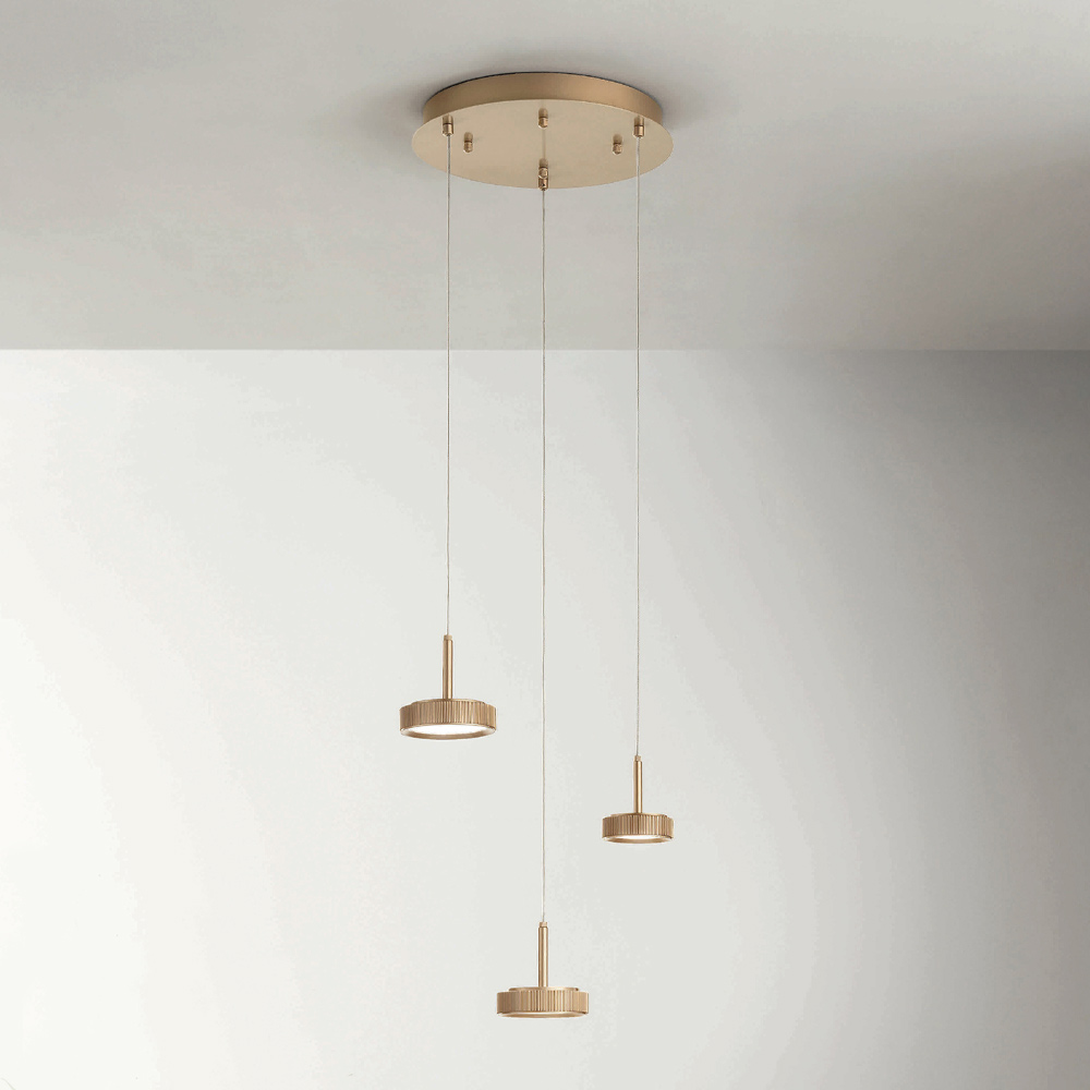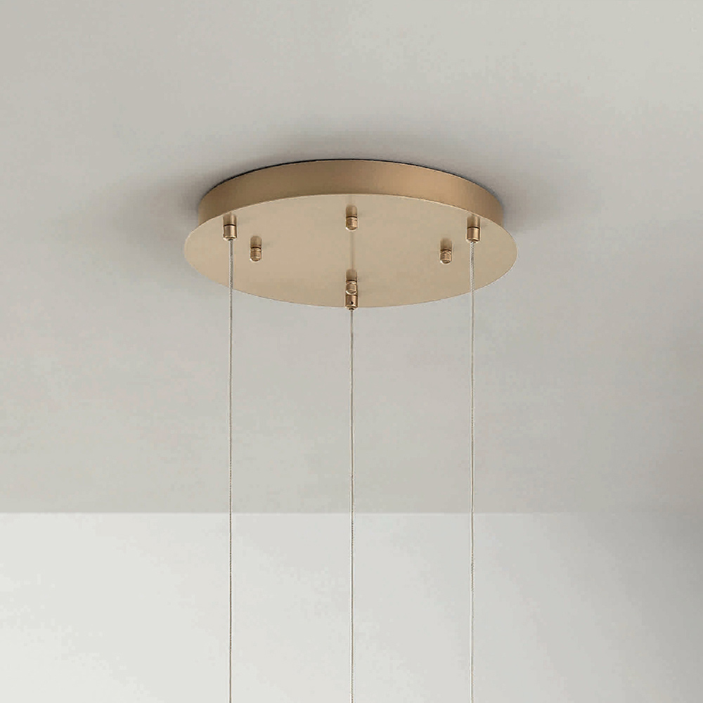 Chandelier entirely produced in Italy made of gold-colored painted metal with adjustable length cables and LED lights. This product aims to enhance tradition through a contemporary approach where style, class and innovation come together to create new design formulas to furnish and illuminate any environment with taste and character. The strong points are the particularity of the shapes , the quality of the materials and the uniqueness of the light source .