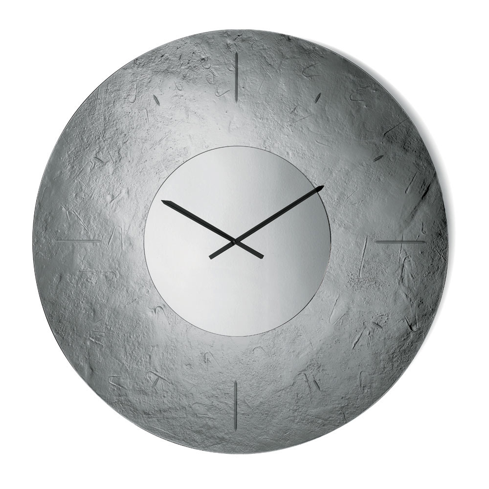 The clock features a visually striking round shape , embellished with a back-silvered hammered fused glass frame that creates a refined interplay of reflections and depth. At the center, a tone-on-tone mirrored insert houses the hands, lending balance and luminosity to the composition.