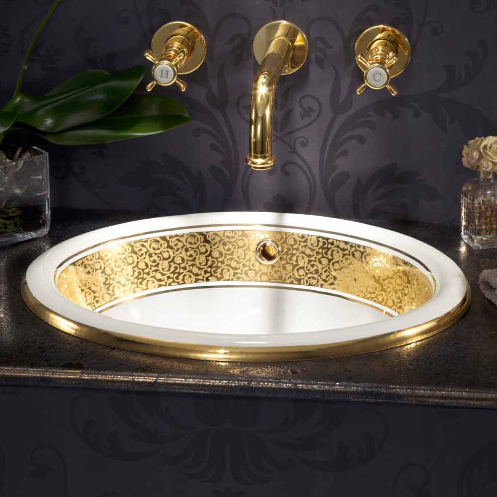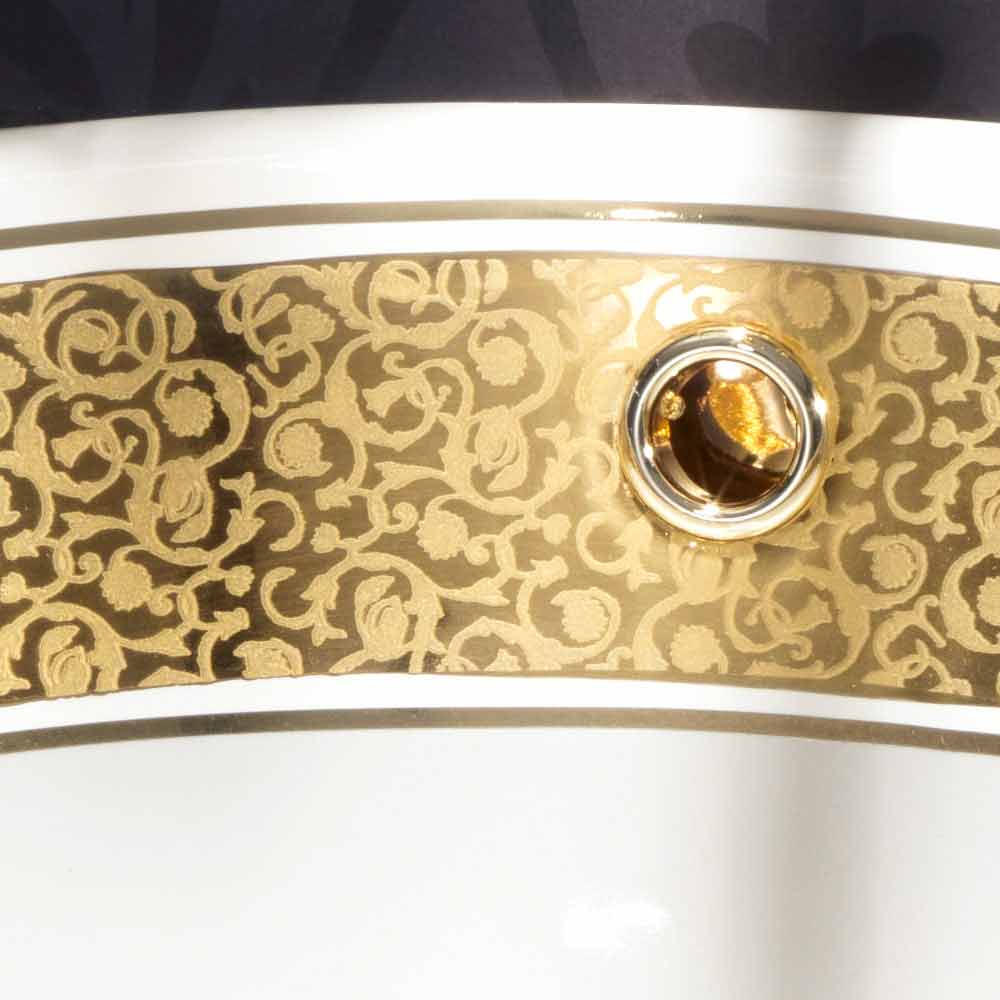Circular built-in washbasin decorated in fire clay and gold, Otis Built-in bathroom sink made in Italy in hand-crafted fire clay decorated with a raised gold band, two fillets and 24-carat gold edge.