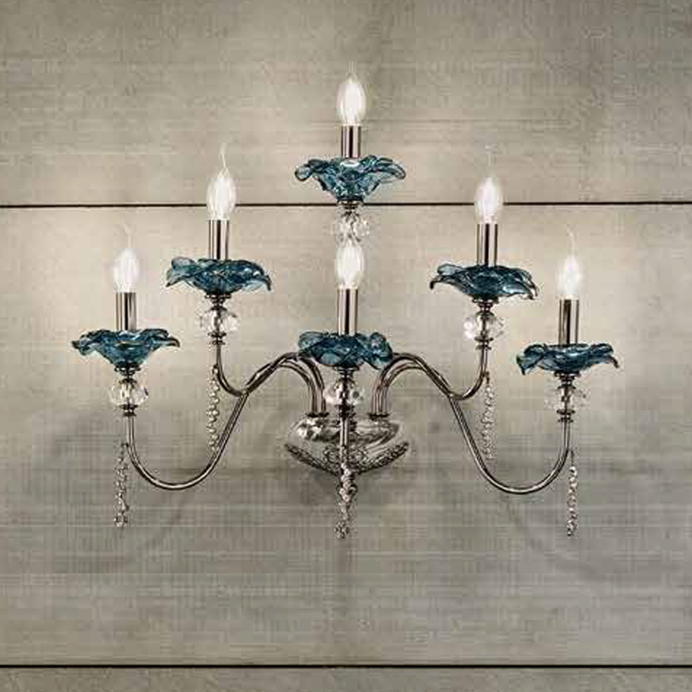6 lights wall lamp in handcrafted glass with buds and crystal drops, luxury made in Italy.