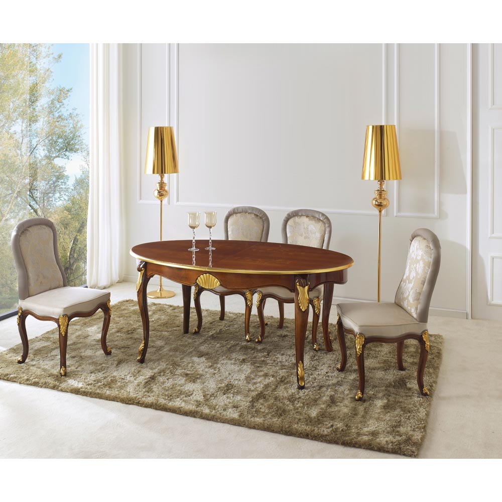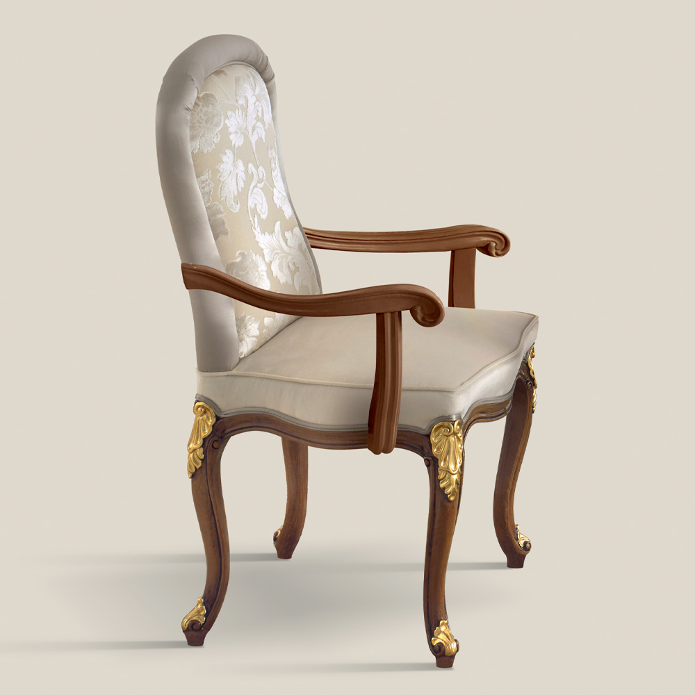 Dining room chair with atimeless classic style , perfect for decorating a living room or dining room with style and elegance . This chair in Bassano walnut and antiqued gold has a padded seat and back upholstered in fabric . It is also possible to choose between the version with or without armrests. A unique and refined complement , completely made in Italy and handcrafted by skilled master craftsmen , masters of art who finish each complement with wisdom and taste for elegance. The production is carried out using fine materials , and performing the workbyhand with the utmost care and professionalism that distinguishes Made in Italy products.