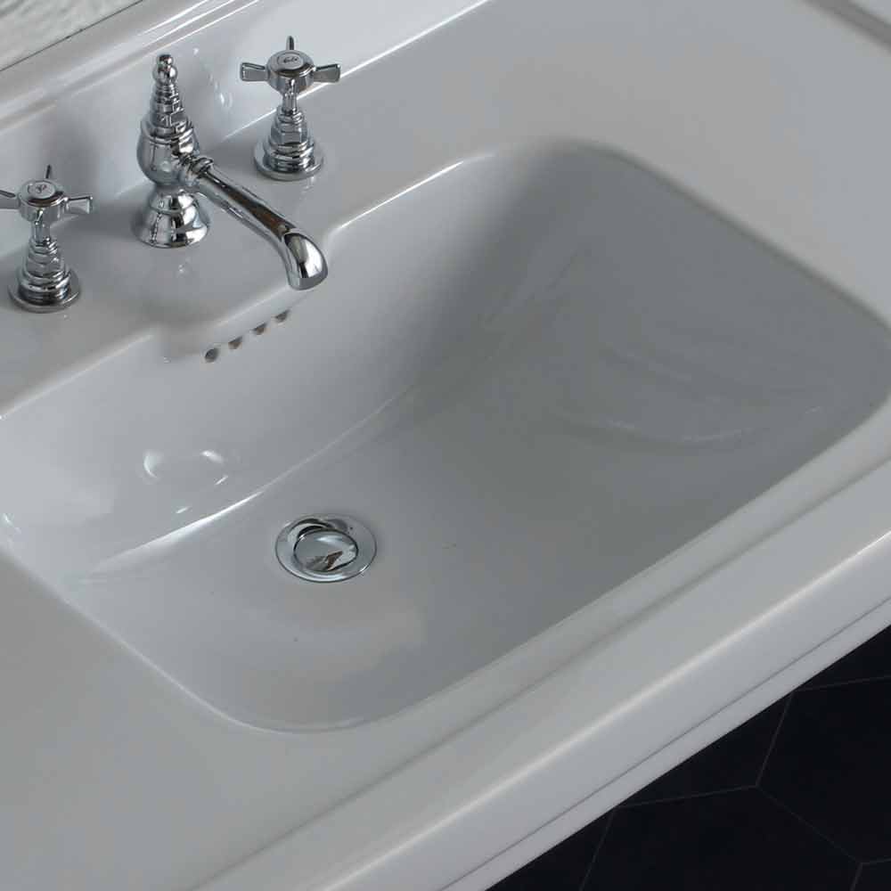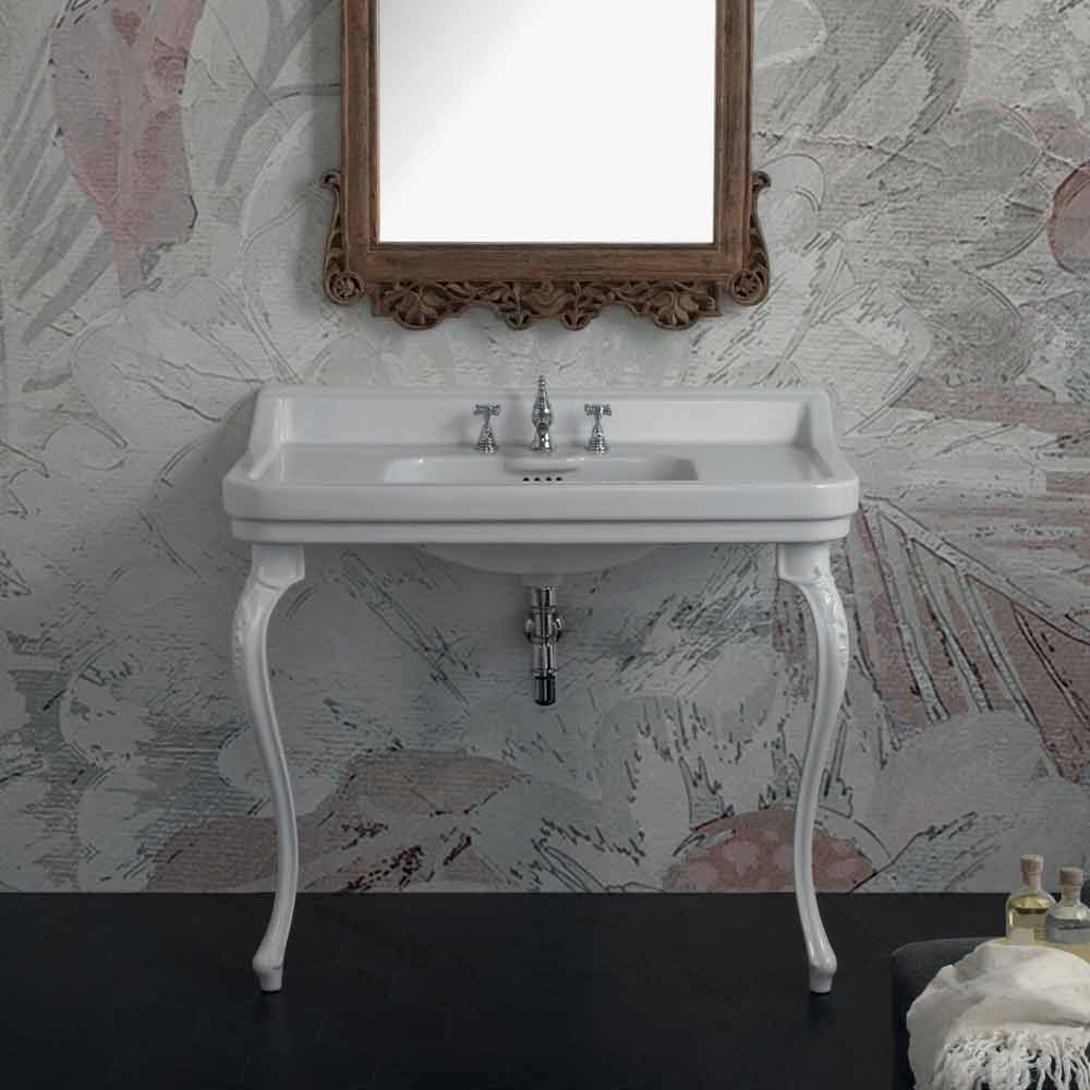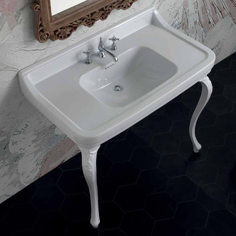 Console washbasin of classic design in ceramic made in Italy, Swami Countertop console washbasin with single basin made entirely of white ceramic. Thanks to its splendid classic design and its functionality it will give your bathroom beauty and practicality.