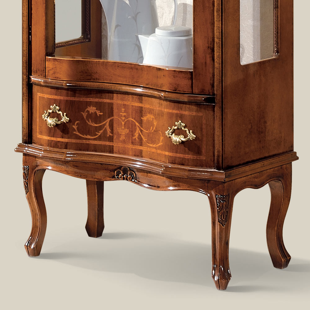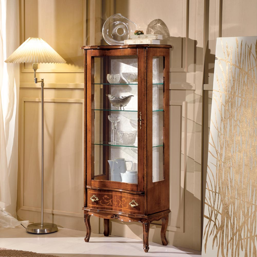 Living room display cabinet made of precious walnut finish wood with one door and one drawer. Elegant and timeless, this classic style display cabinet is ideal for creating impressive settings. Completely made in Italy and handcrafted by skilled master craftsmen , finished with wisdom and taste for elegance. The production is carried out using fine materials , and performing the workbyhand with the utmost care and professionalism that distinguishes Made in Italy products.