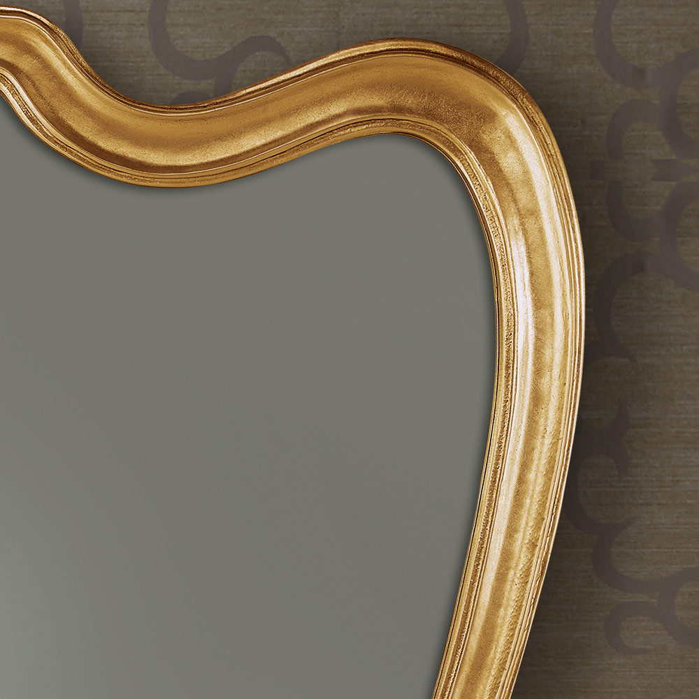 Shaped mirror with wooden frame decorated with gold leaf . Thanks to its classic style , this mirror is ideal for giving an elegant and luxurious touch to any environment. A unique and refined complement, completely made in Italy by skilled master craftsmen , masters of art who finish each complement with wisdom and taste for elegance. The production is carried out using fine materials , and performing the workbyhand with the utmost care and professionalism that distinguishes Made in Italy products.