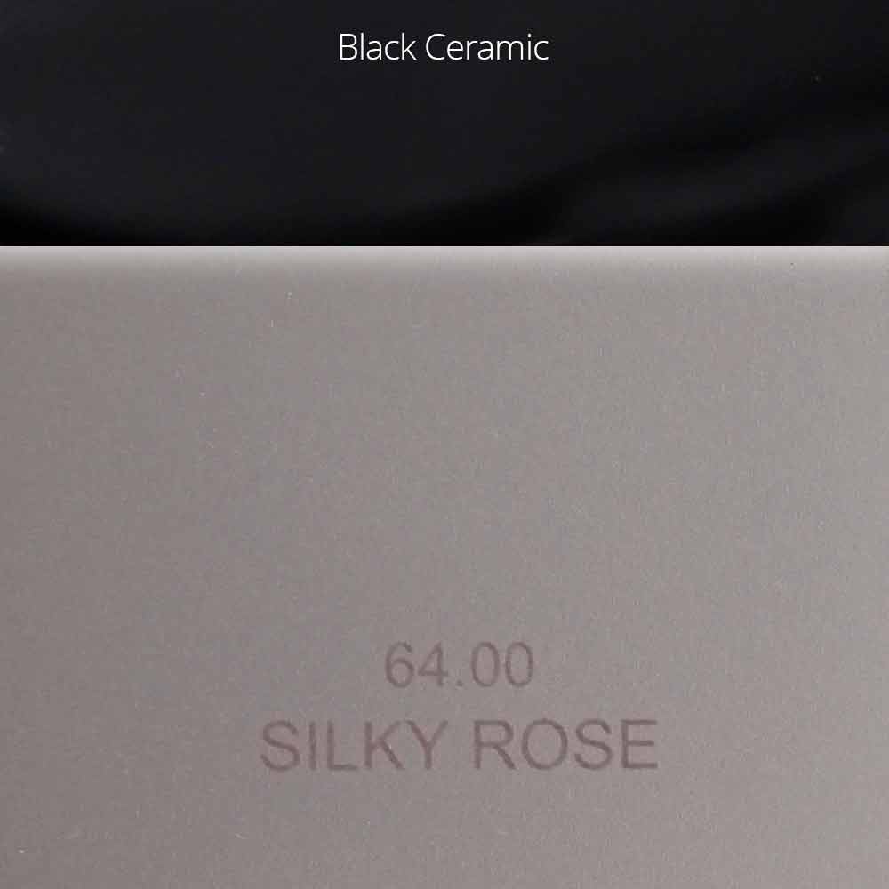 Silky Rose: matt pink metallic finish with black ceramic inserts on the handles;