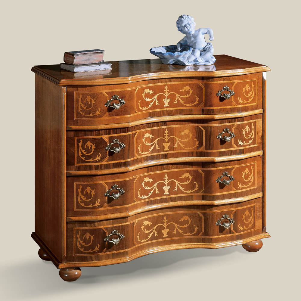 Classic style chest of drawers made of precious polished walnut wood with golden inlays . This practical and refined piece of furniture available in the version with four or five drawers, is completely made in Italy and handcrafted by skilled master craftsmen , finished with wisdom and taste for elegance. The production is carried out using fine materials , and performing the workbyhand with the utmost care and professionalism that distinguishes Made in Italy products.