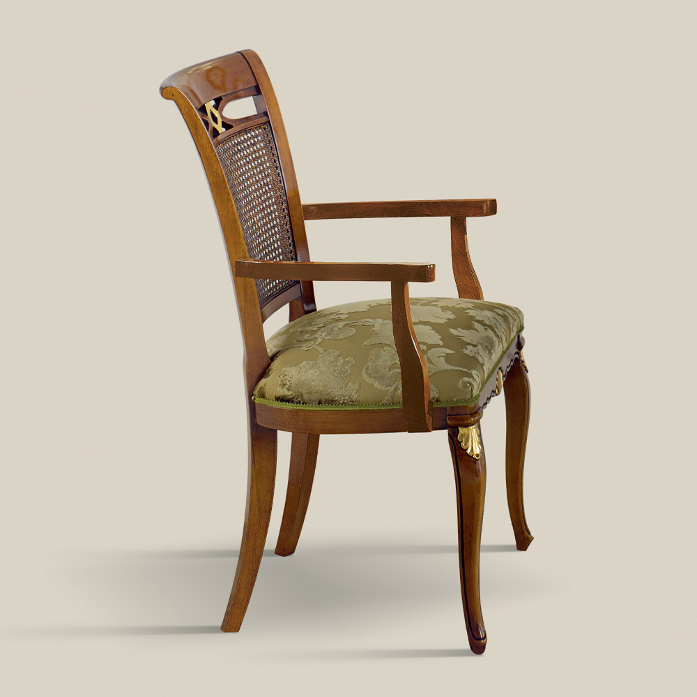 Dining room chair with atimeless classic style , perfect for decorating any living area with personality and elegance . This chair has a structure made of wood with Bassano walnut and antique gold finish and a seat with a padded seat covered in fabric with a backrest made of Vienna straw . It is also possible to choose between the version with or without armrests.