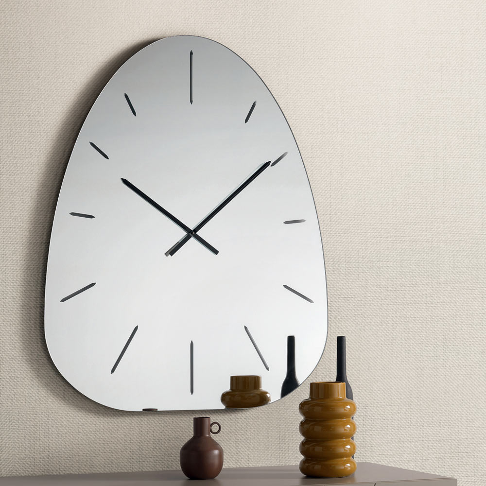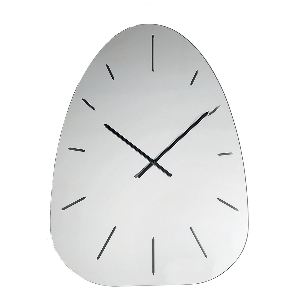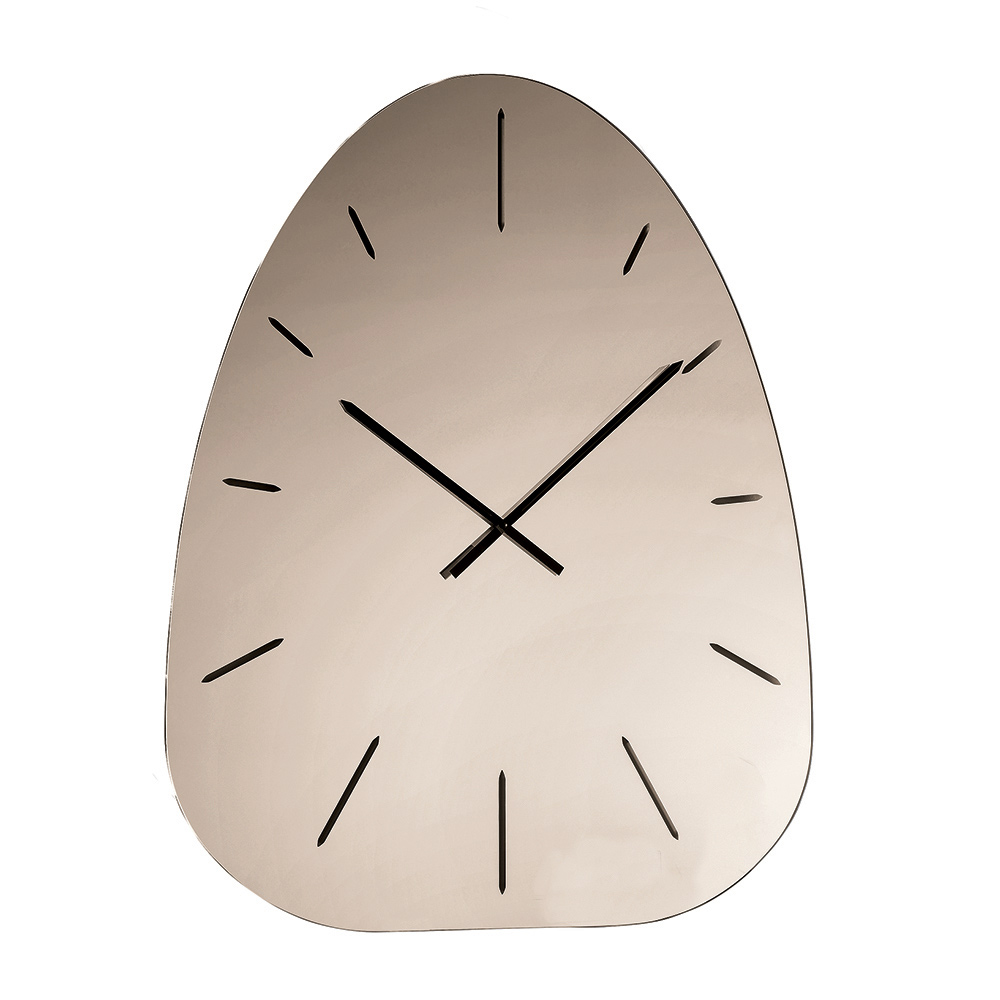 Made of mirrored glass , the watch stands out for its laser-engraved numbers that discreetly emerge from the reflective surface, creating a refined play of light and depth that varies throughout the day.