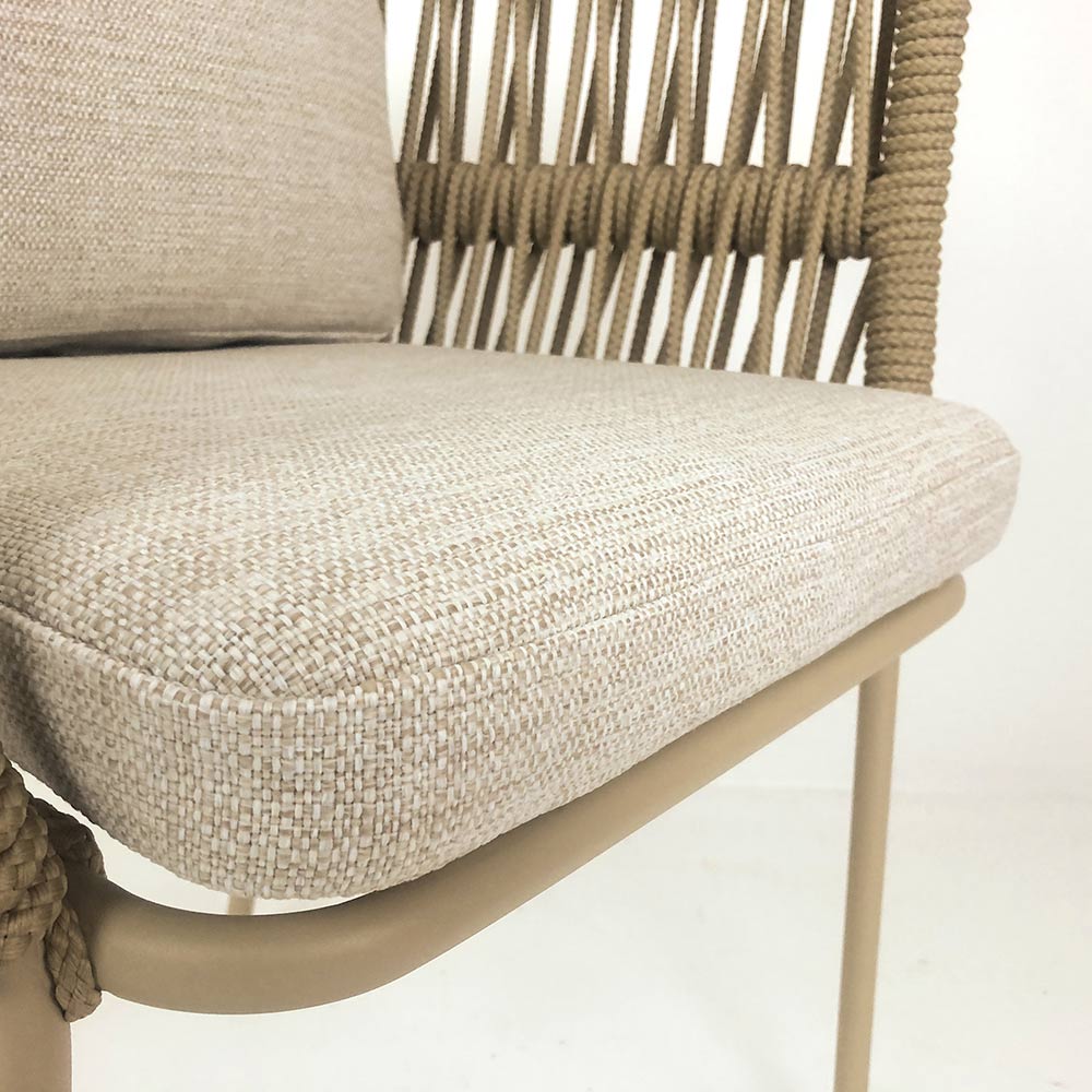 The Cliff dining armchair features a frame made of beige synthetic rope and cushions in 100% PP fabric with removable covers in the same color, padded with dry foam. Synthetic rope is a double-braided material with a polyester core and a multi-filament propylene covering. The outer fiber is waterproof and UV-resistant.