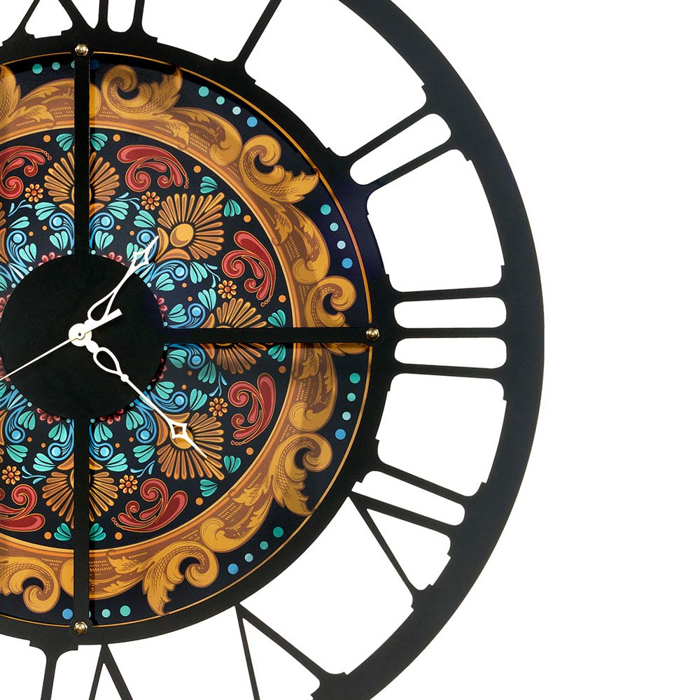 The clock, with Roman numeral dial, combines traditional beauty with the ruggedness of iron. The lively decoration gives the product a unique, sophisticated and eye-catching look. The refined and colorful decoration is carefully distributed on the dial, giving it a unique look that attracts the attention of anyone who enters the room. The patterns and shades evoke a sense of calm and tranquility but also energy and vitality.